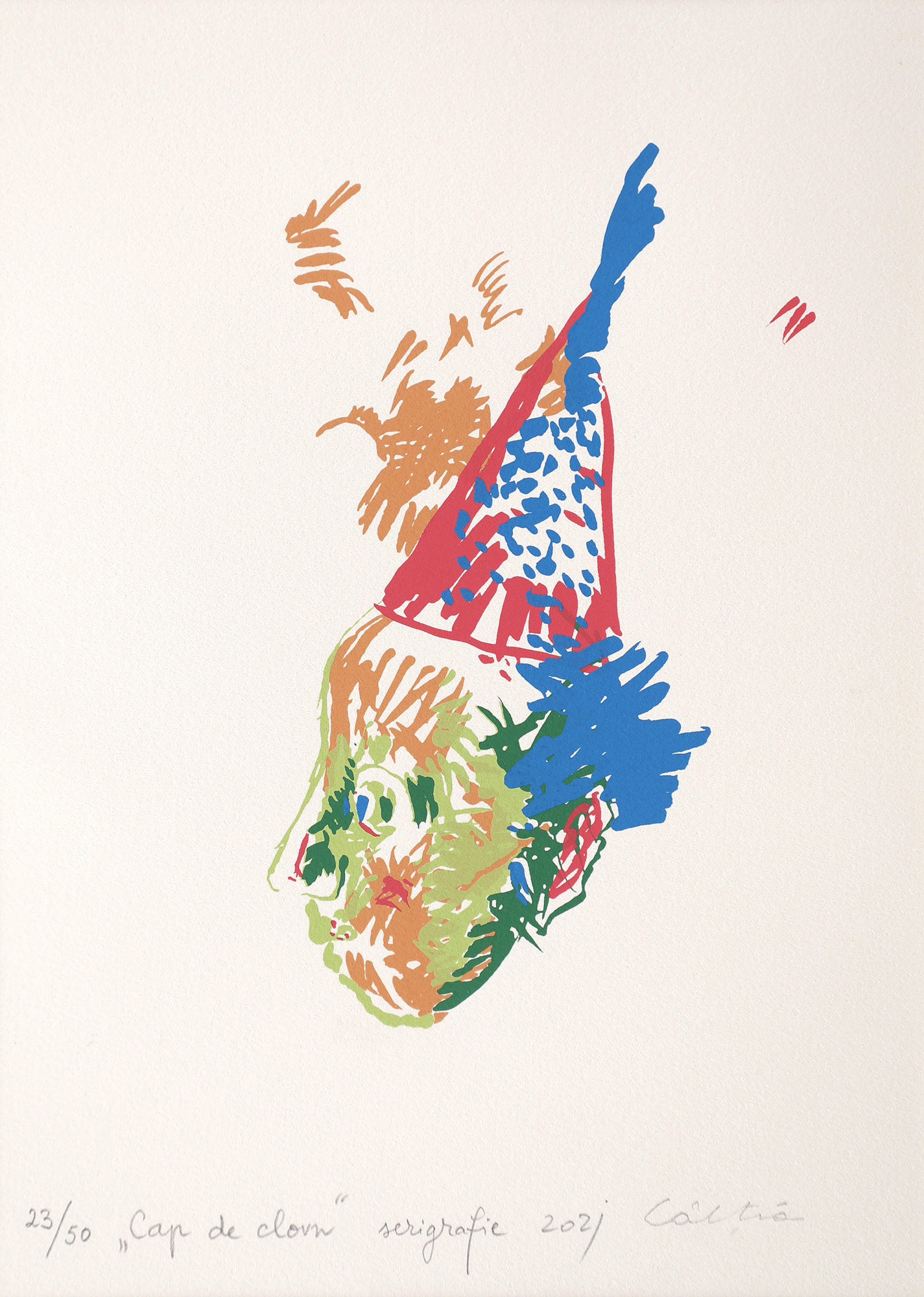 semnat, datat, intitulat și numerotat central jos, în creion, "Câlția, 2021, Cap de clovn, 33/50"