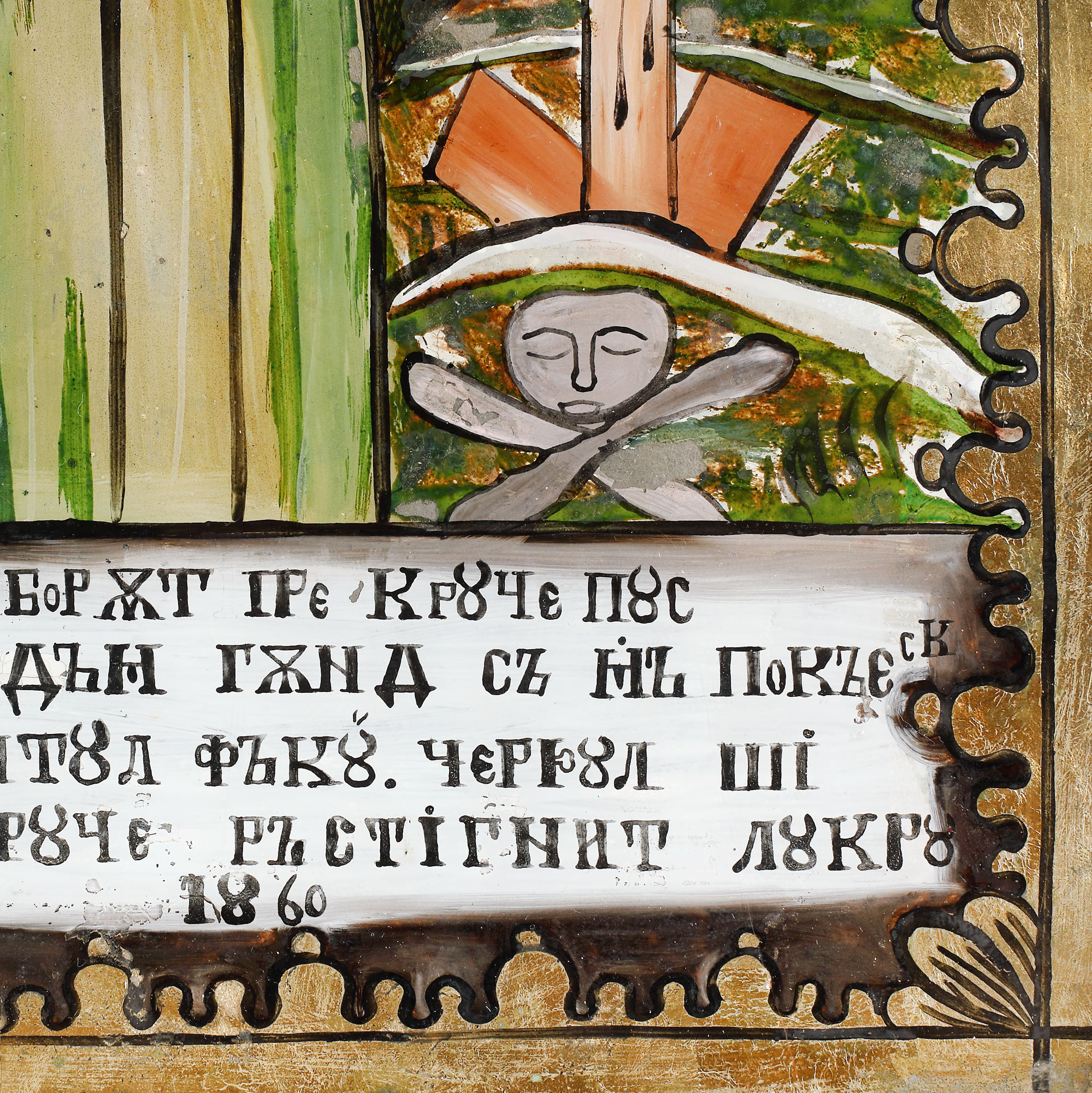 7Т. Icoană pe glajă, ”Maica Domnului Îndurerată”, zugrav Savu Moga, Arpașu de Sus, Făgăraș, 1860, piesă extrem de rară, de colecție