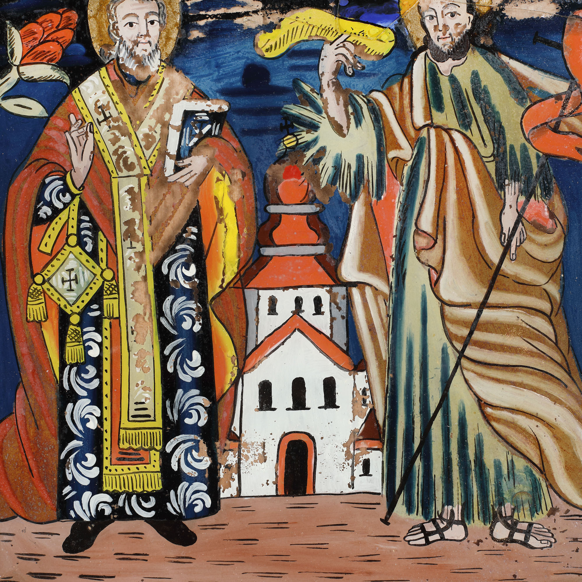 14. Icoană pe glajă, ”Sfântul Ierarh Nicolae și Sfântul Ioan Botezătorul”, atelier din Banat, mijlocul sec. XIX, raritate absolută, de colecție