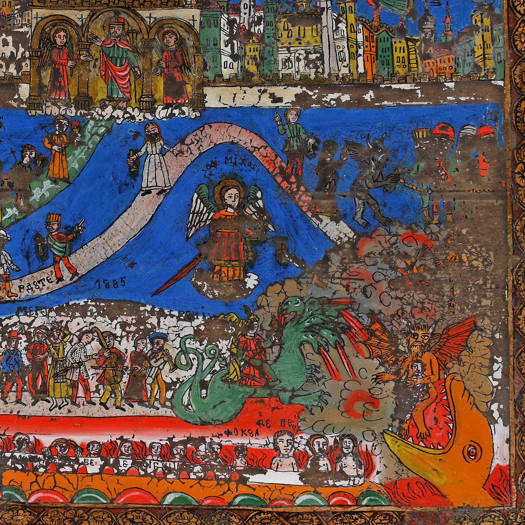 11. Icoană pe glajă, ”Înfricoşătoarea Judecată de Apoi”, atribuit zugrav Matei Țâmforea, Cârțișoara, 1885, piesă rară