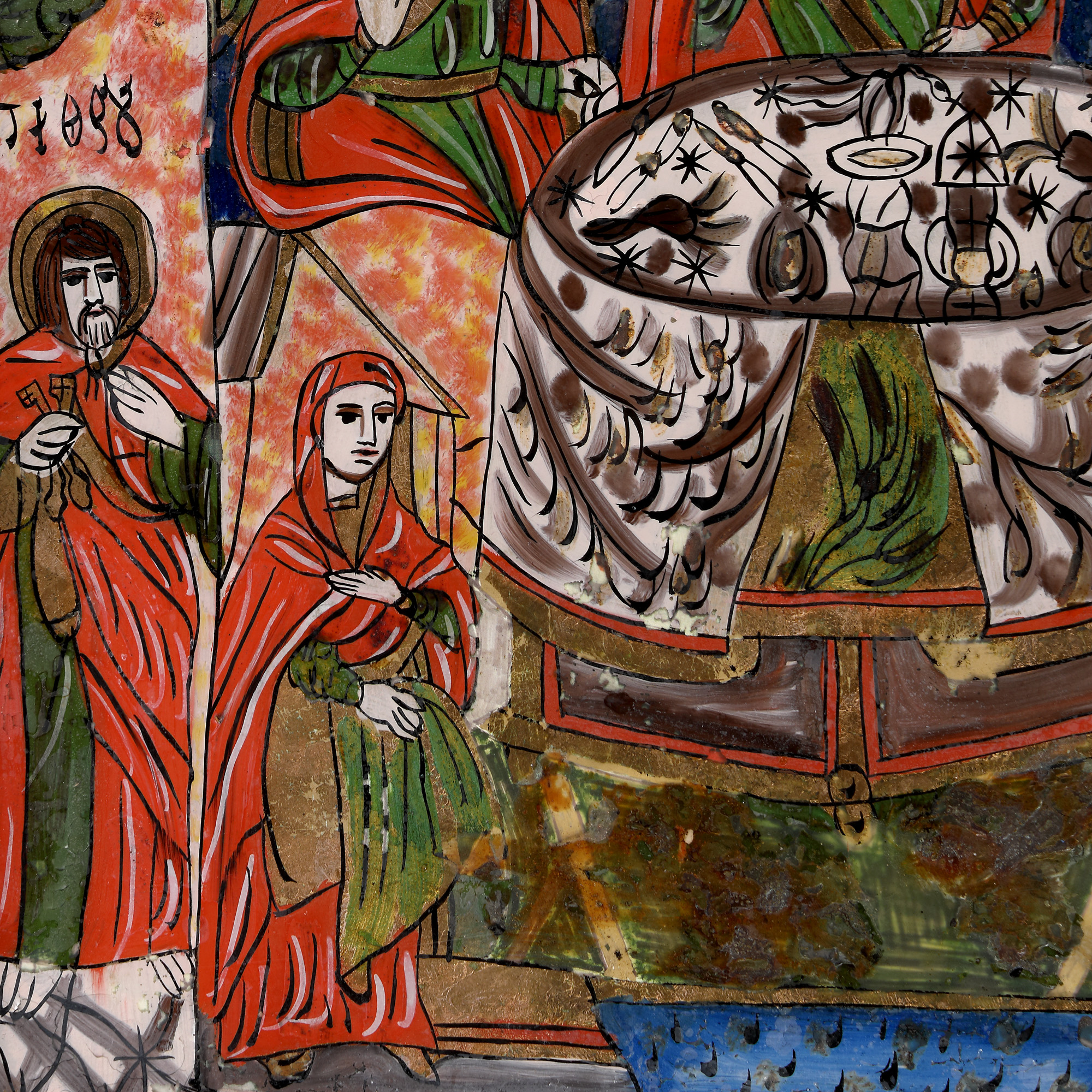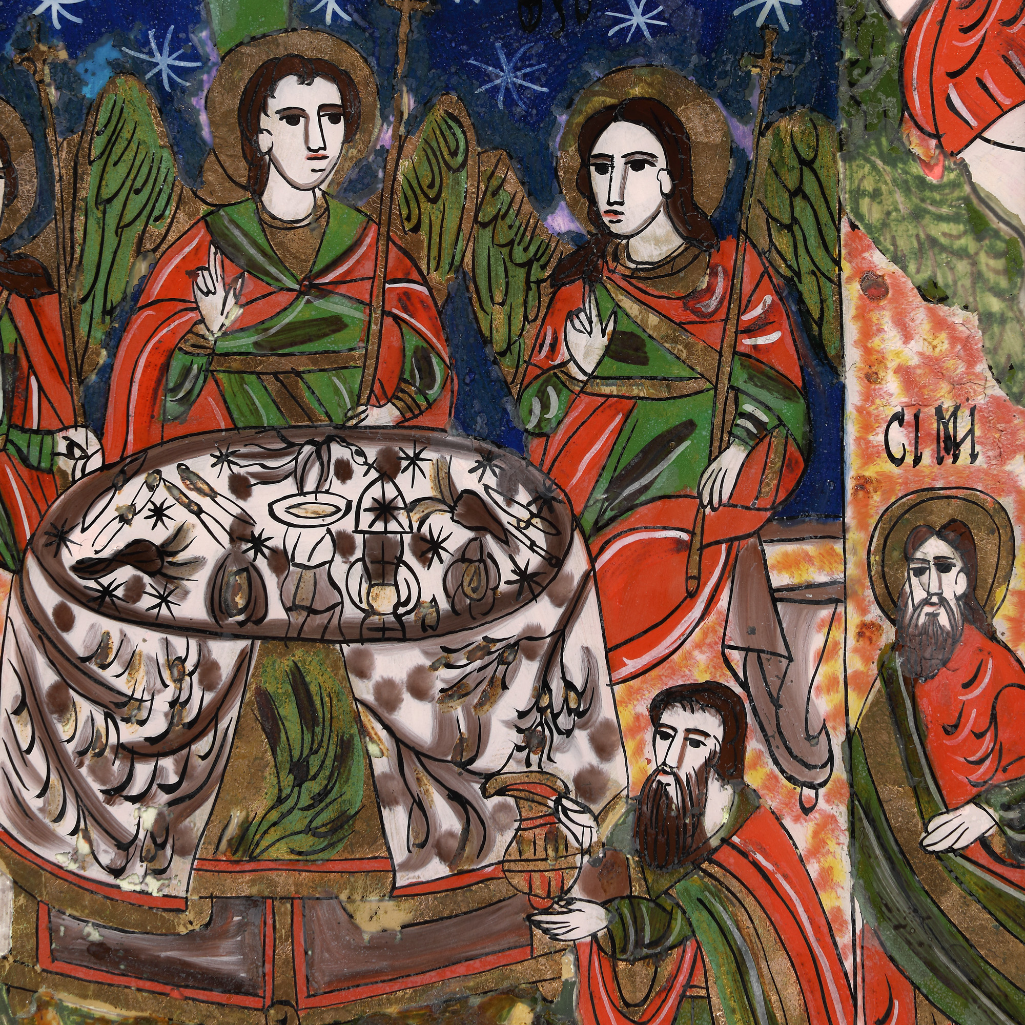 7. Icoană pe glajă, "Sfânta Treime (Cina de la Mamvri)”, ramă pictată, atelier din Țara Făgărașului, prima jumătate a sec. XIX, piesă rară, de colecție