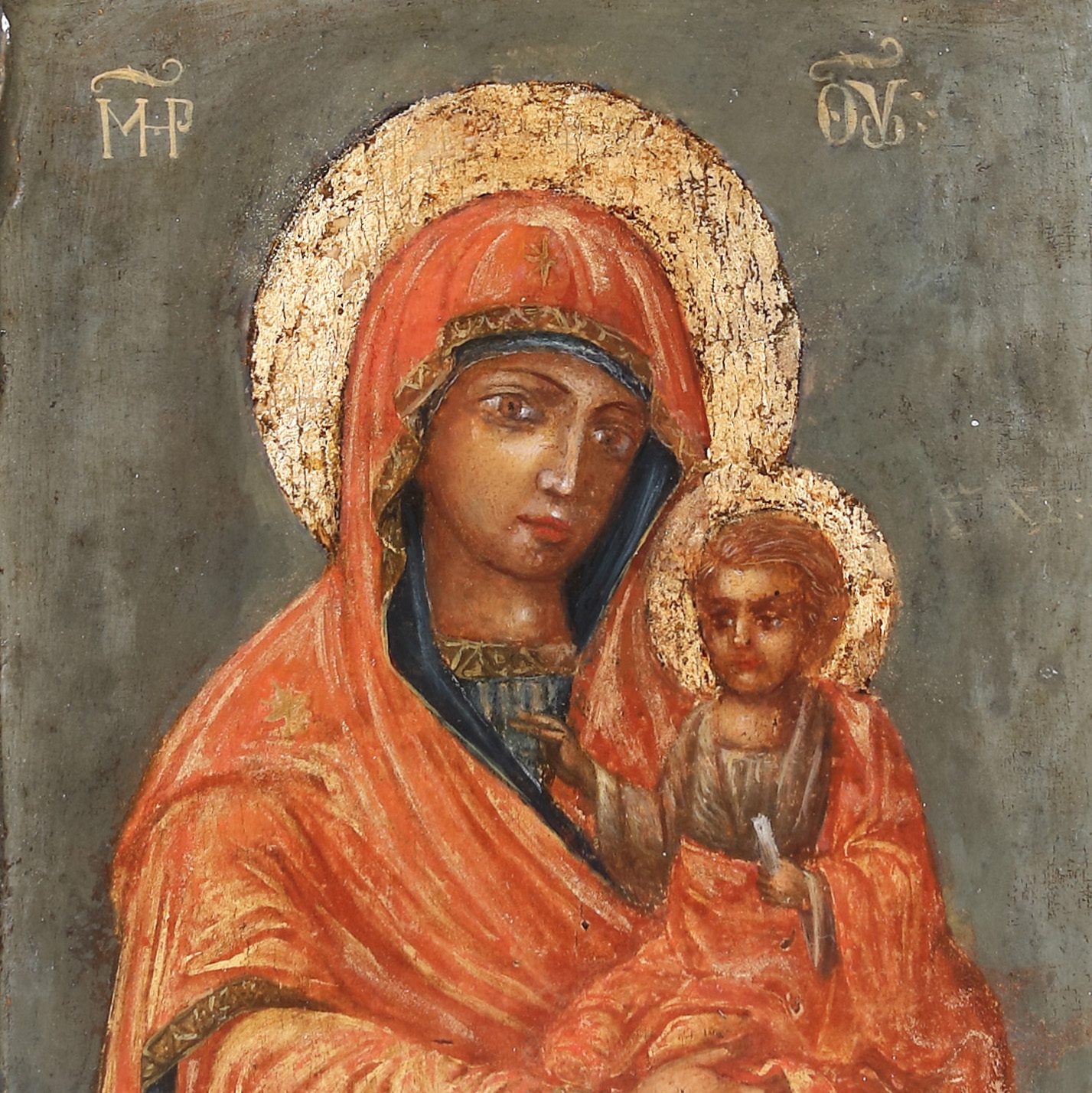 50. Icoană pe lemn, ”Maica Domnului cu Pruncul (Hodighitria)”, ramă sculptată, școală românească, jumătatea sec. XIX