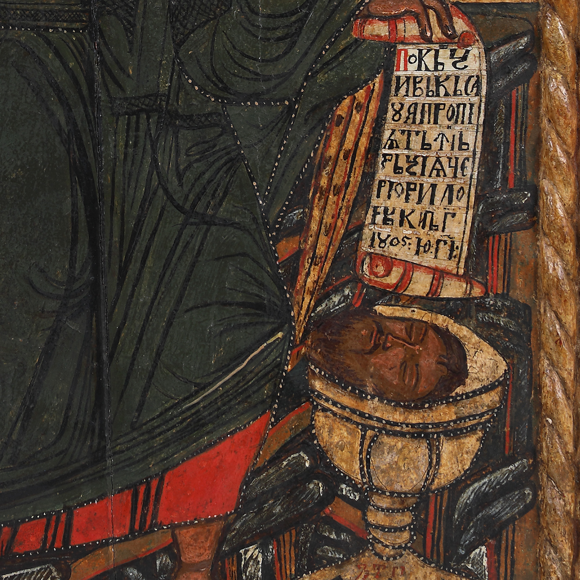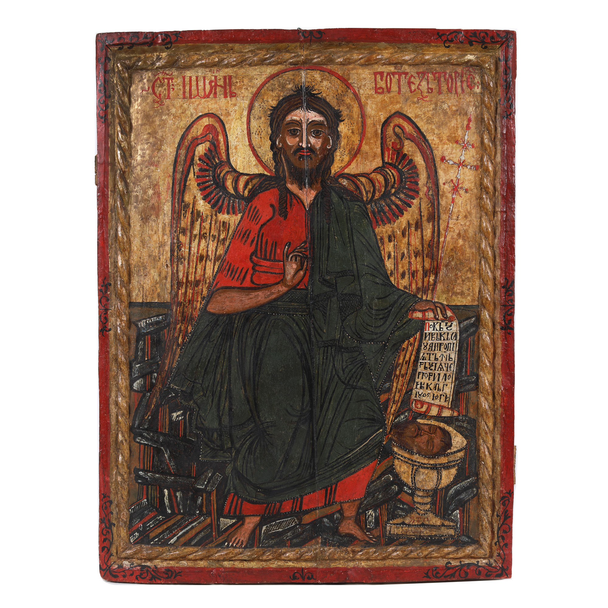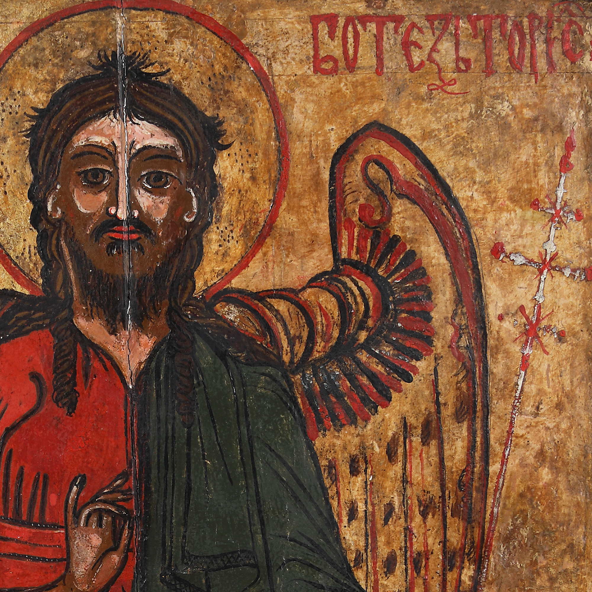 42. Icoană pe lemn, ”Sfântul Ioan Botezătorul - Îngerul deşertului”, ramă sculptată, școală transilvăneană, 1805