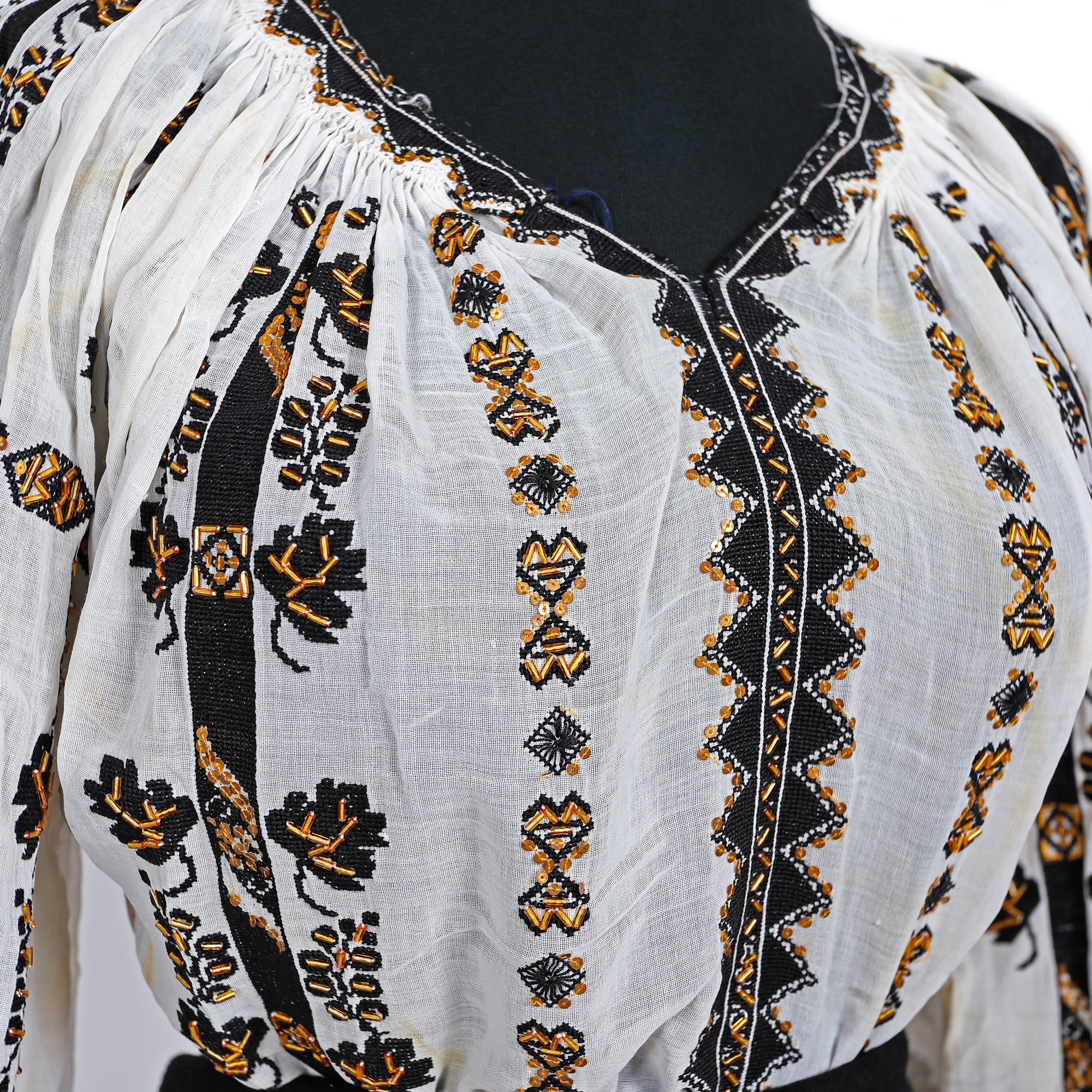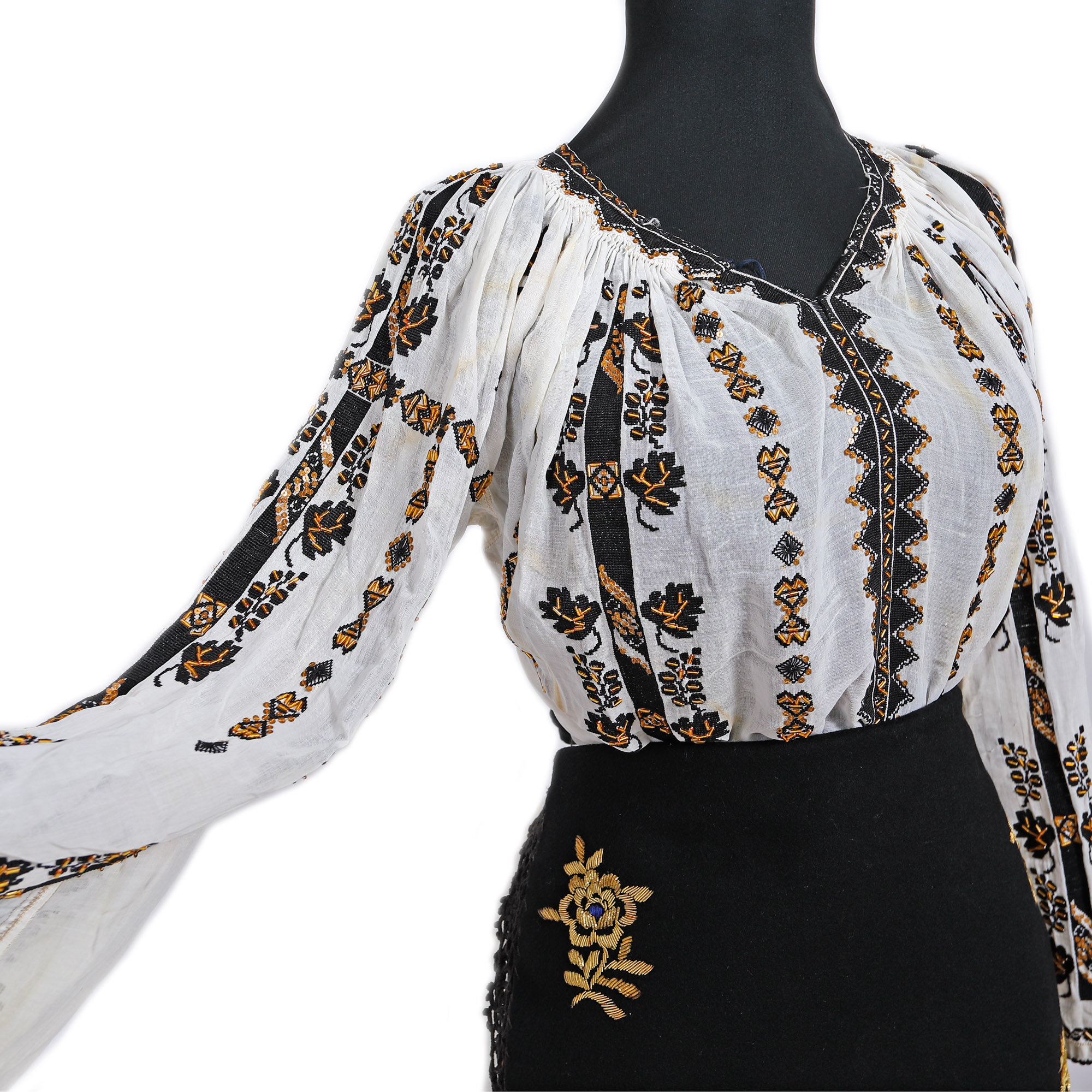 22. Costum popular alcătuit din ie și fotă, reprezentativ pentru zona Gorj, mijlocul sec. XX