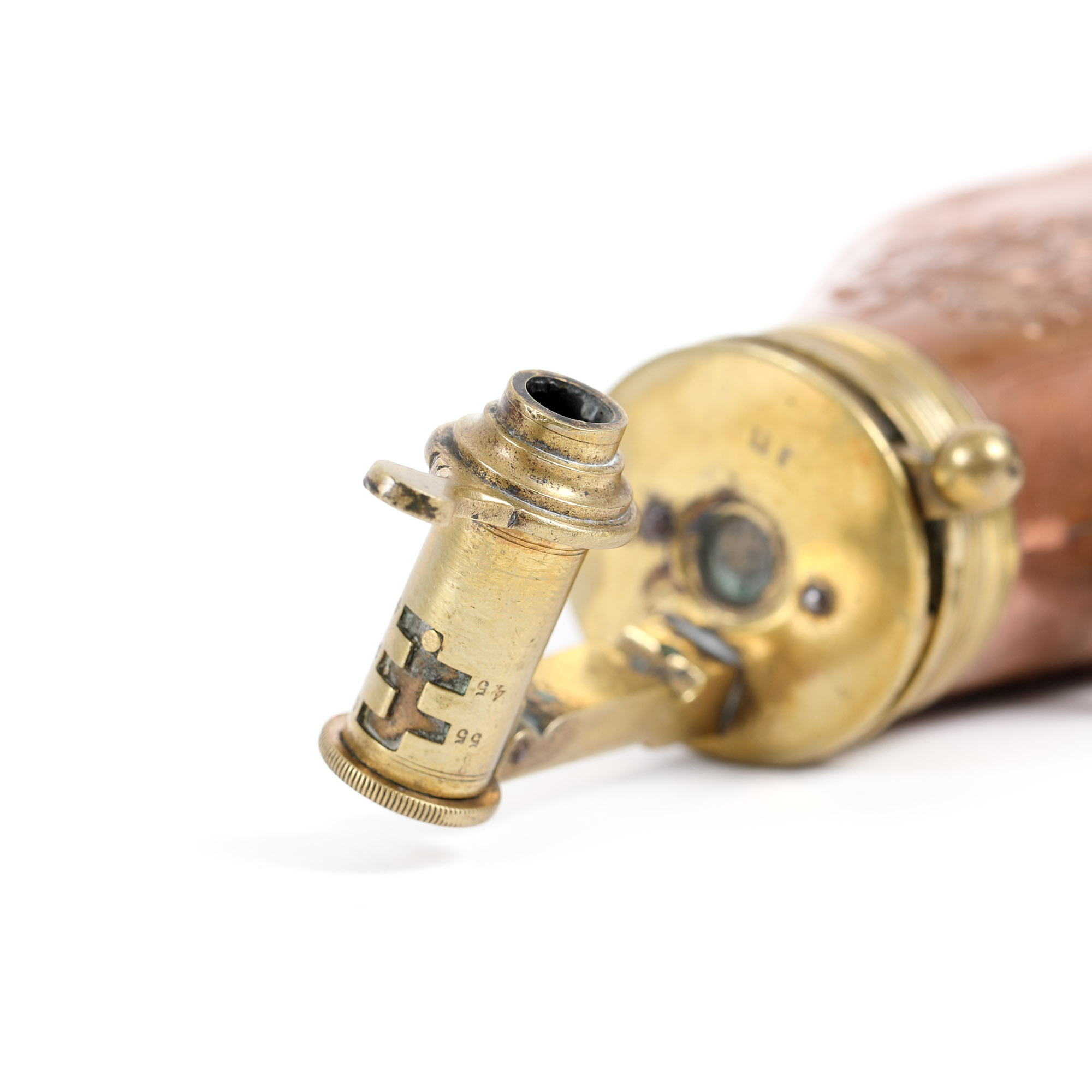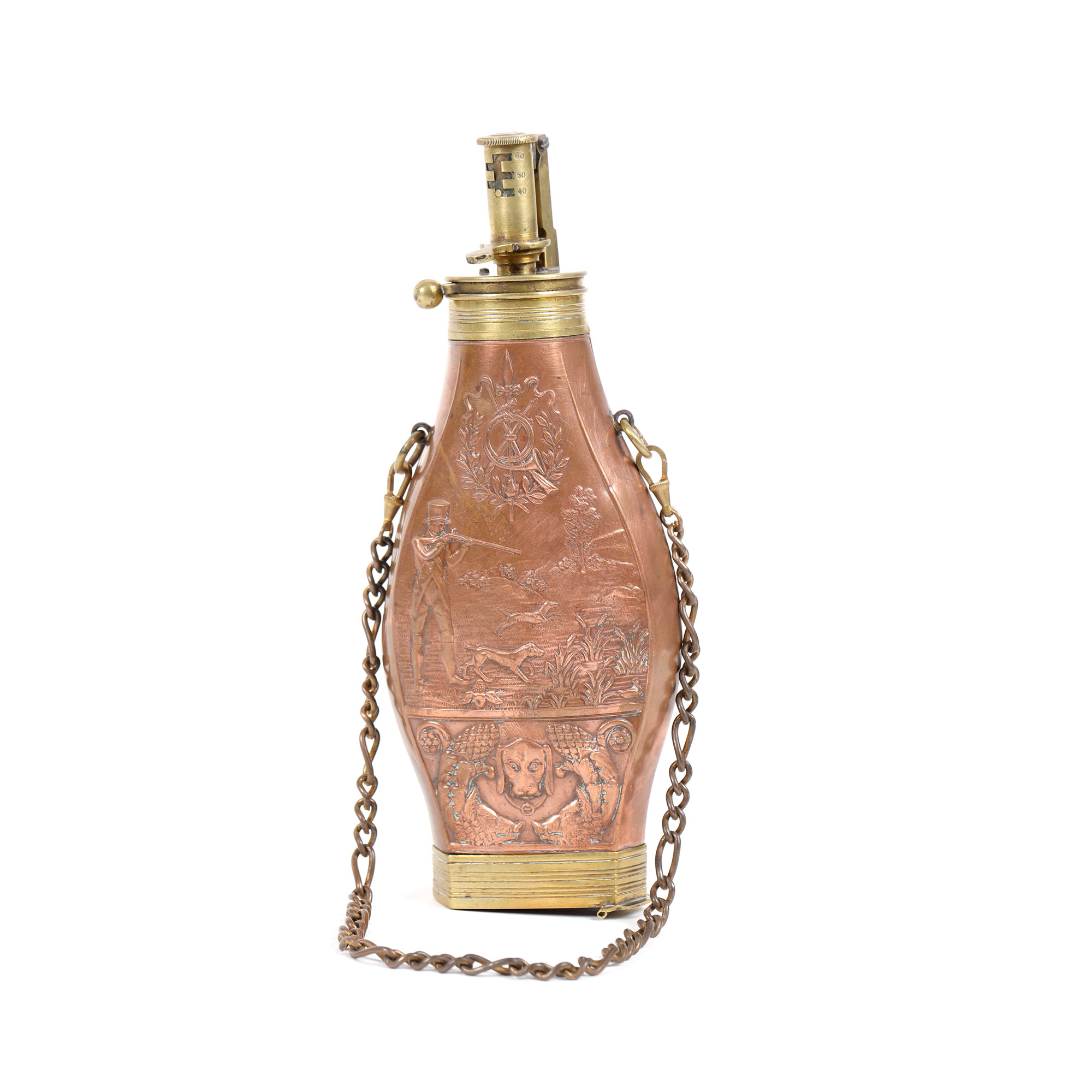 27. Recipient din cupru, pentru praf de pușcă, decorat cu scene de vânătoare, posibil Franța, începutul sec. XX