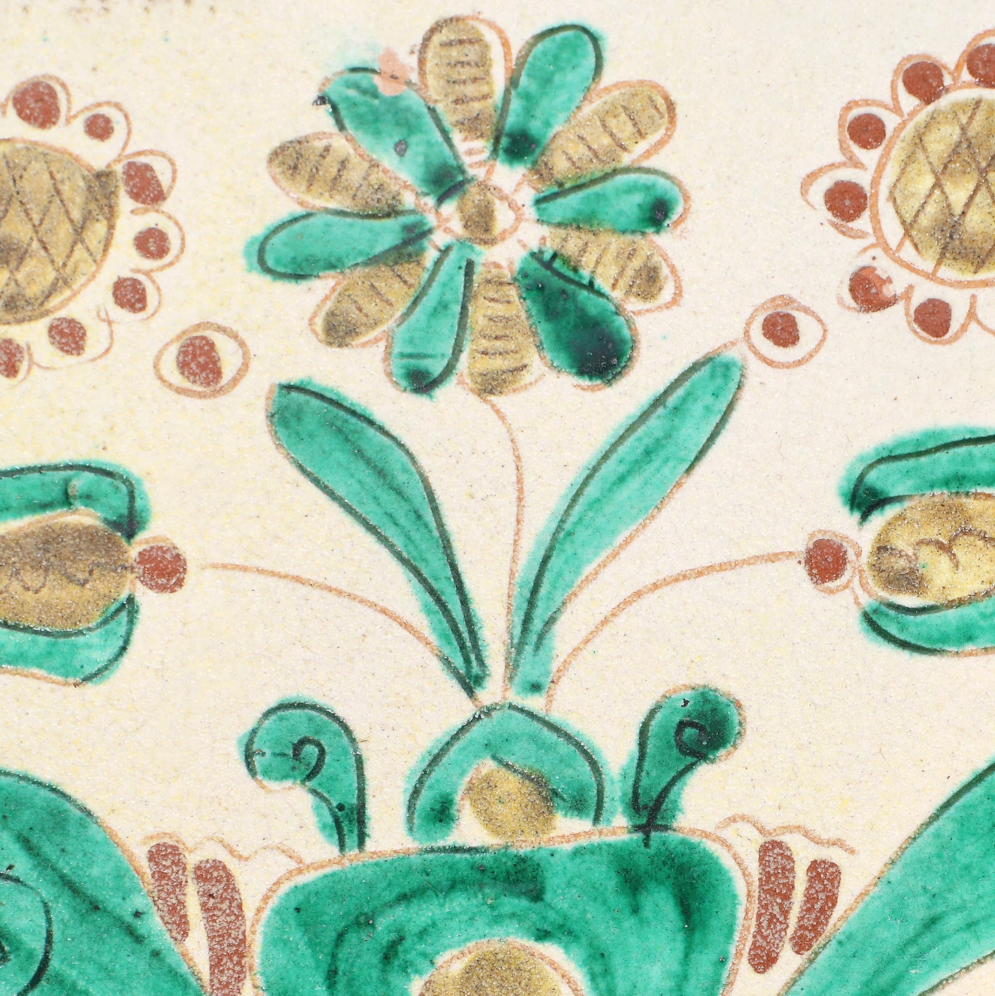 21. Cahlă din teracotă tip Kuty, decorată cu lalele și soare, semnată Colibaba, prima jumătate a sec. XX