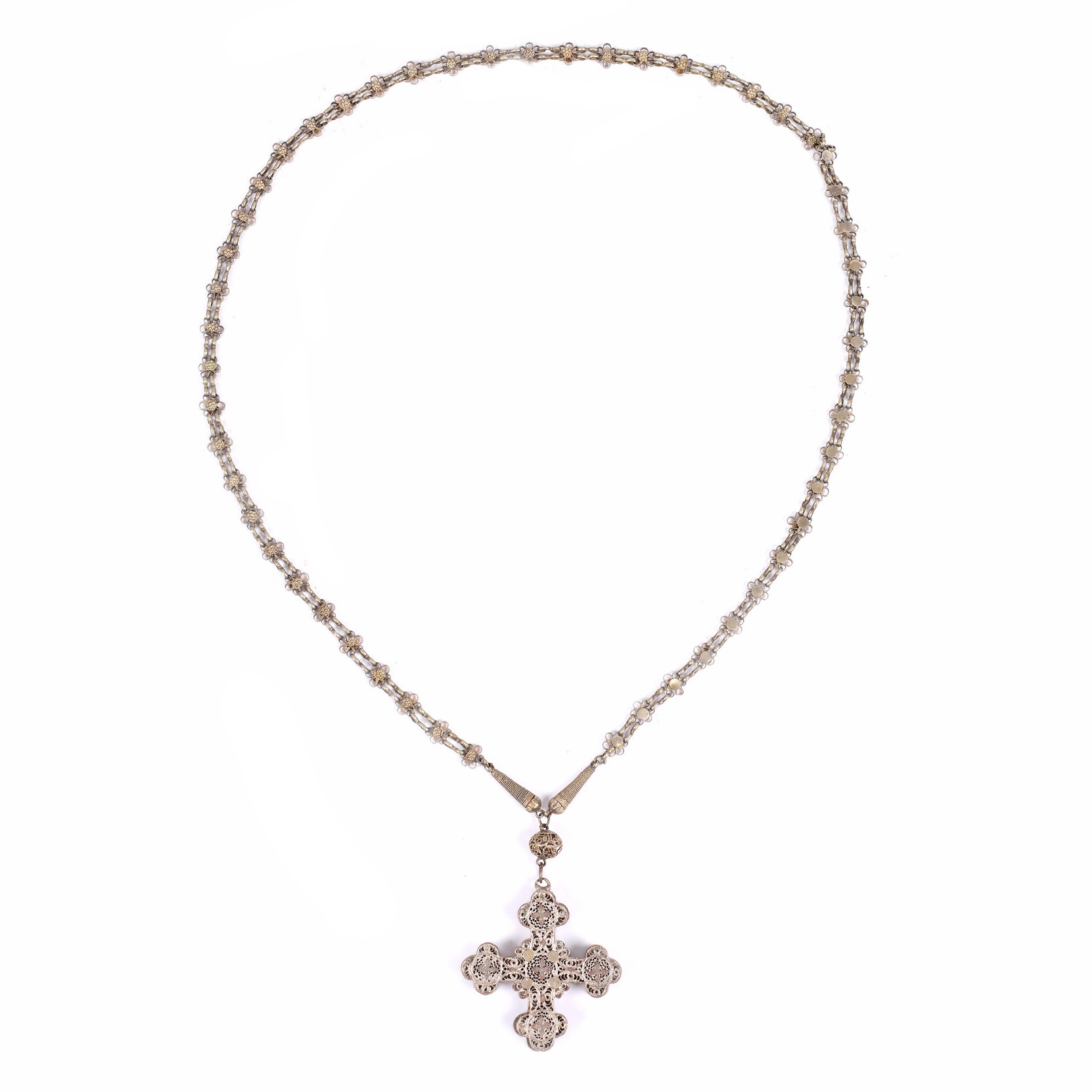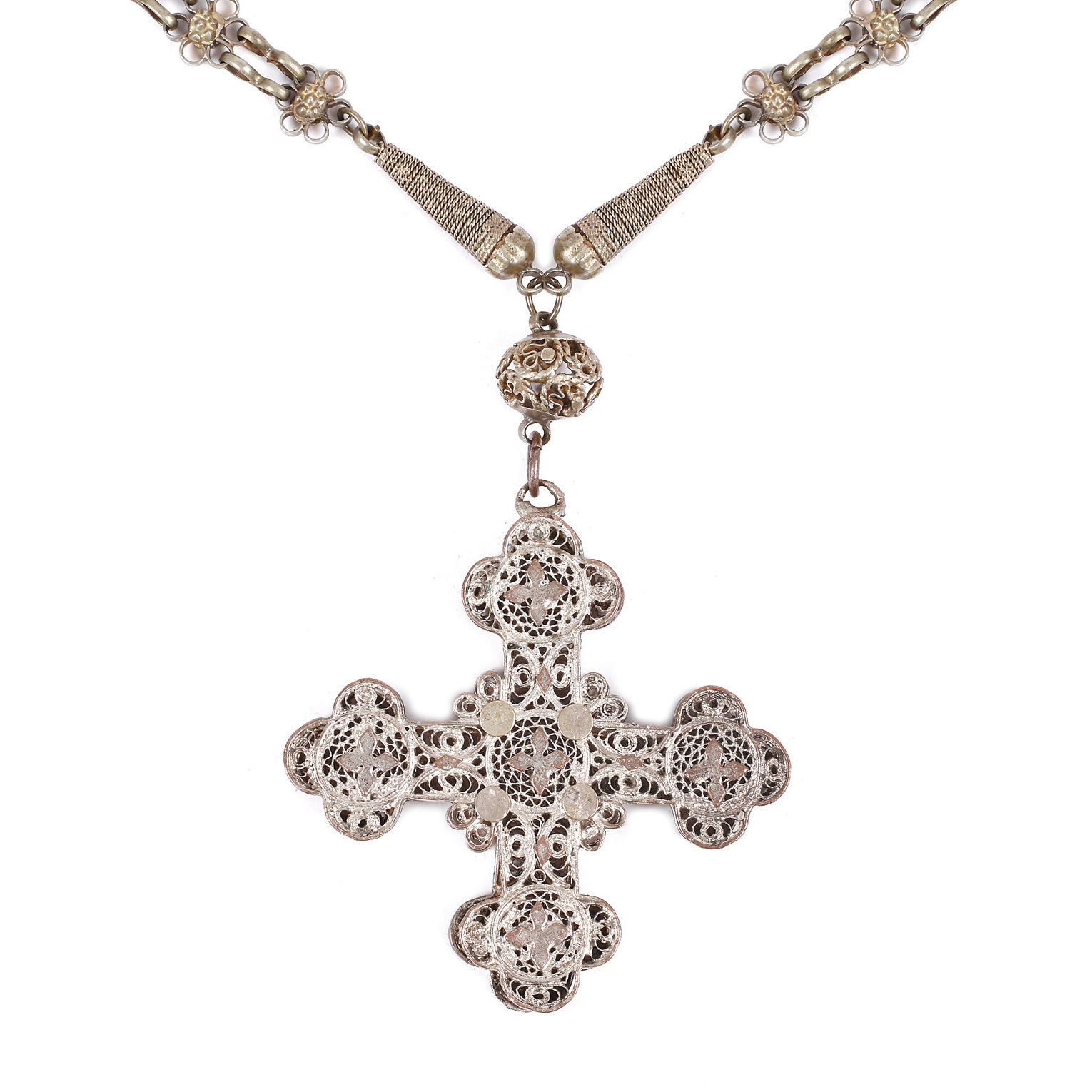 55. Cruce pectorală din filigran, cu lanț, din alamă și cupru argintat, zona balcanică, mijlocul sec. XIX
