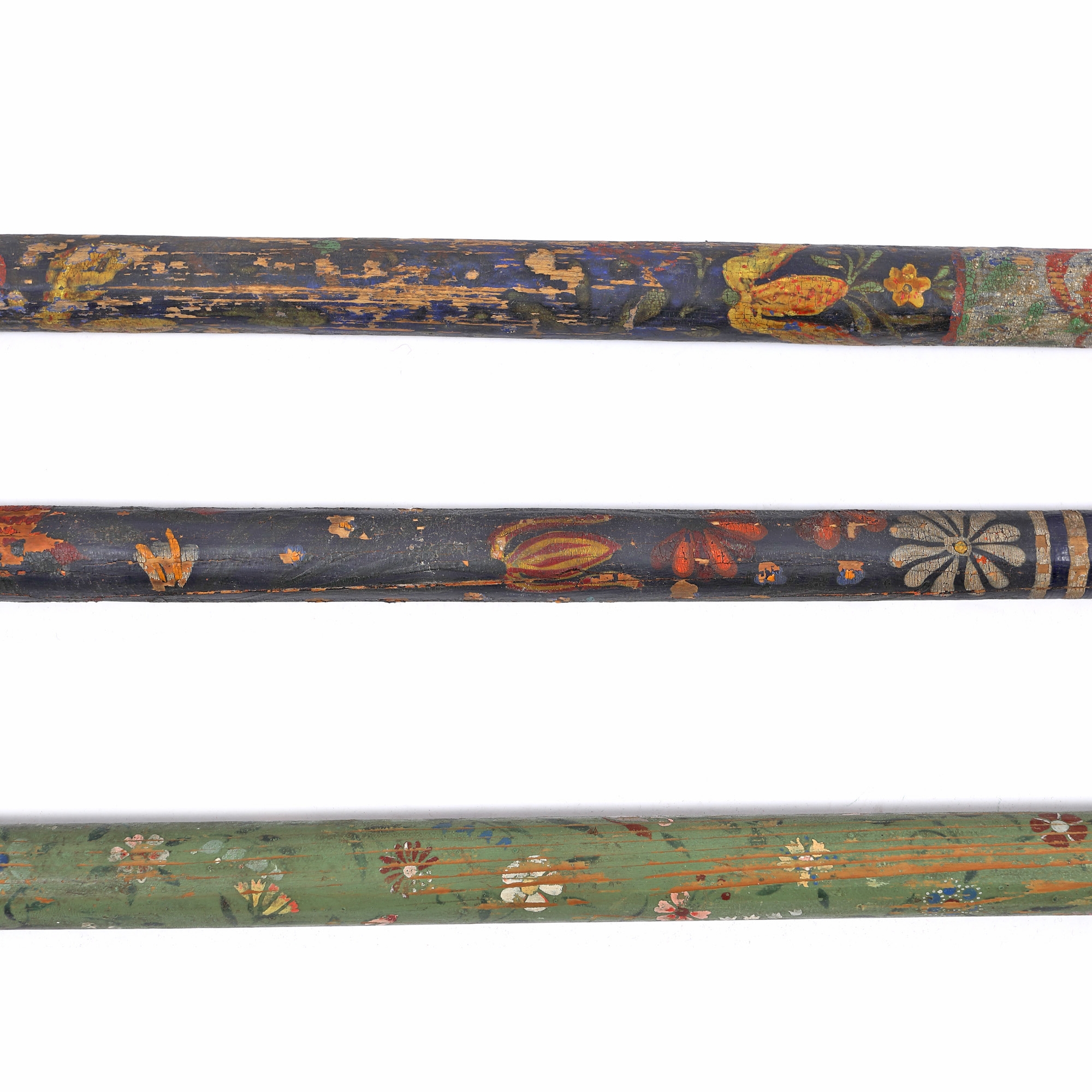 lemn pictat manual policrom cu motive florale, capetele superioare sculptate prin incizie și basorelief, unul dintre capete detașabil