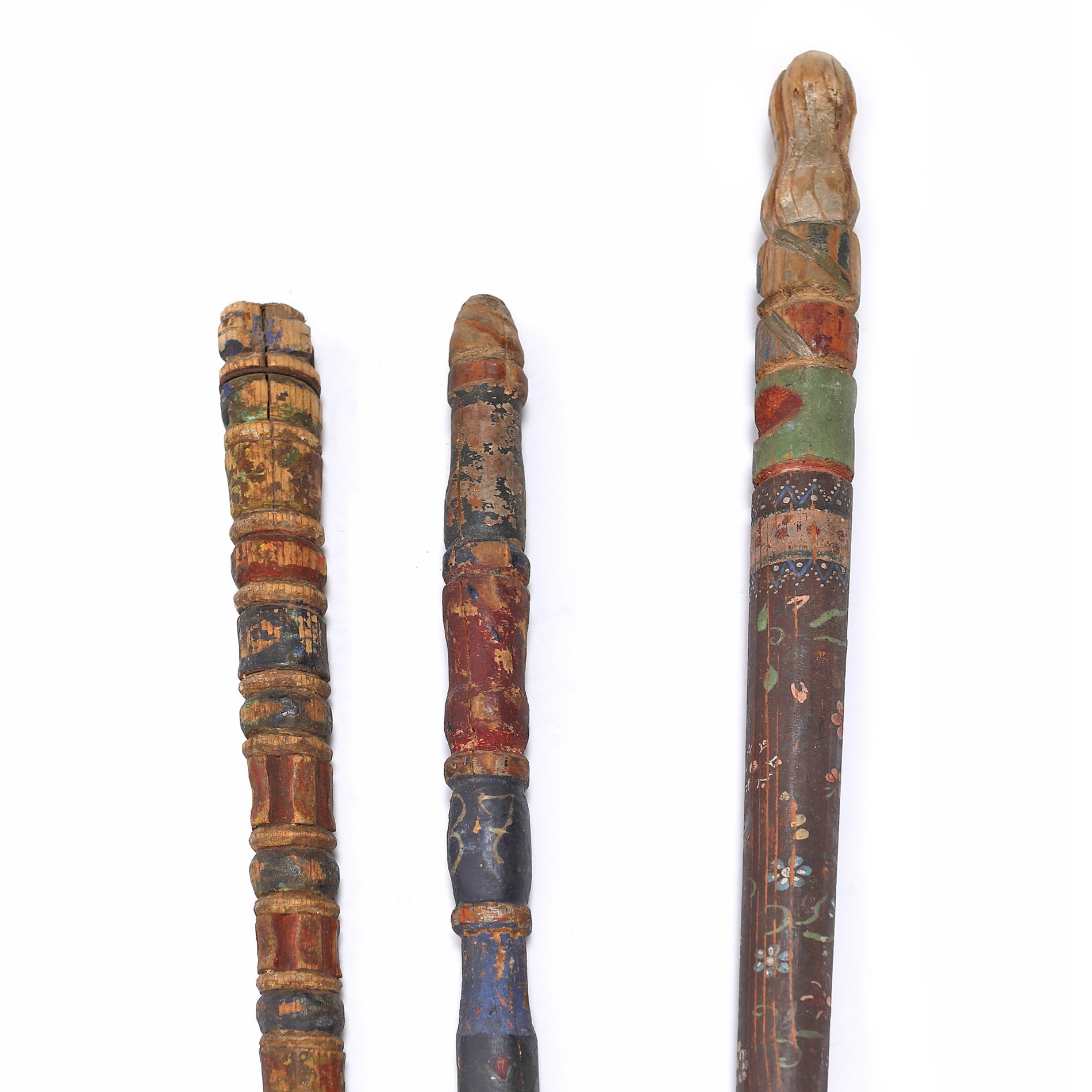 24. Lot format din trei furci de tors, din lemn pictat, zona Viscri, dintre care una datată 1937