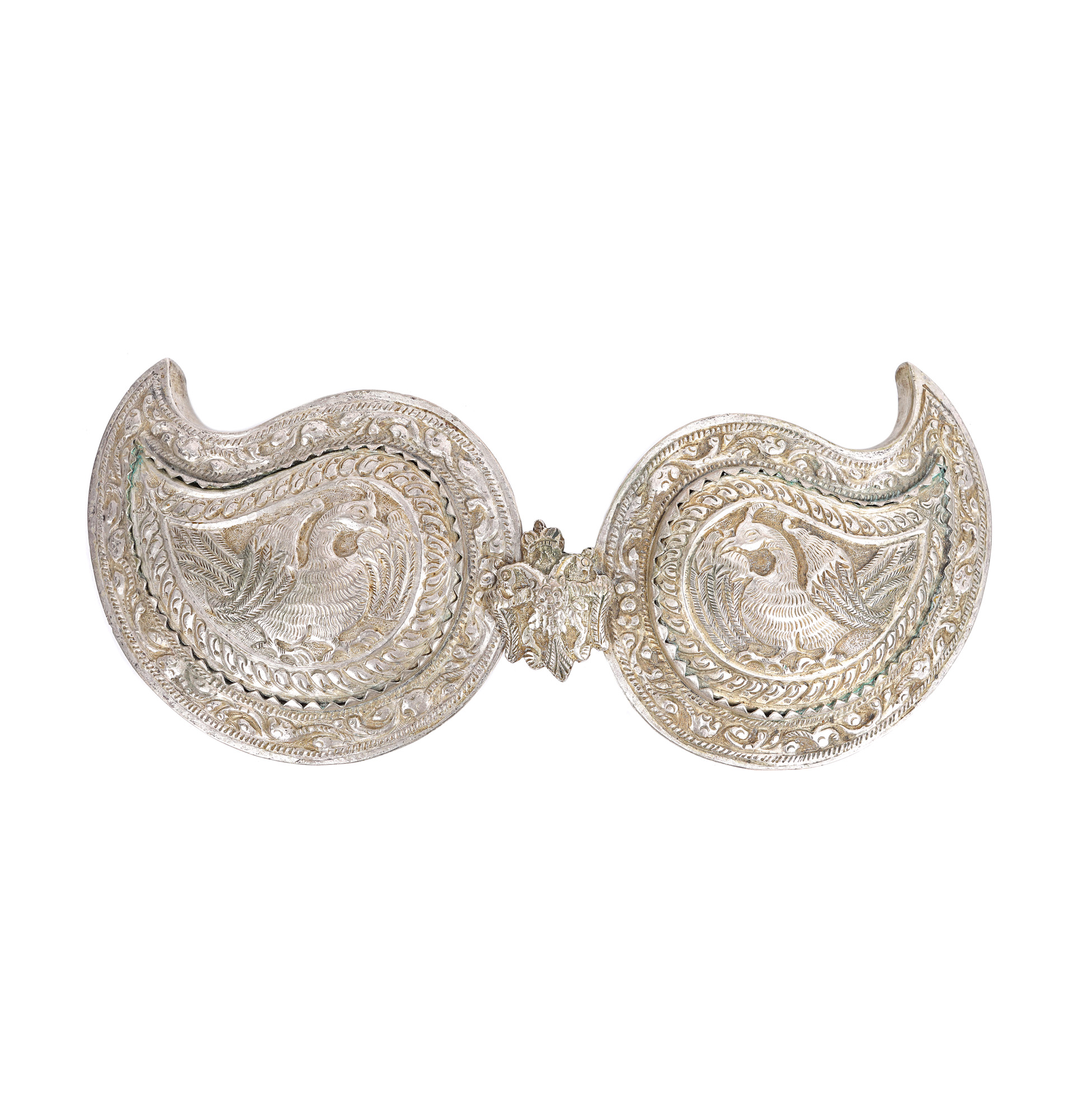 39. Pafta din argint, de circulație balcanică, decorată cu motivul păsării Edenului și acvila bicefală încoronată, nordul Bulgariei, sfârșitul sec. XIX