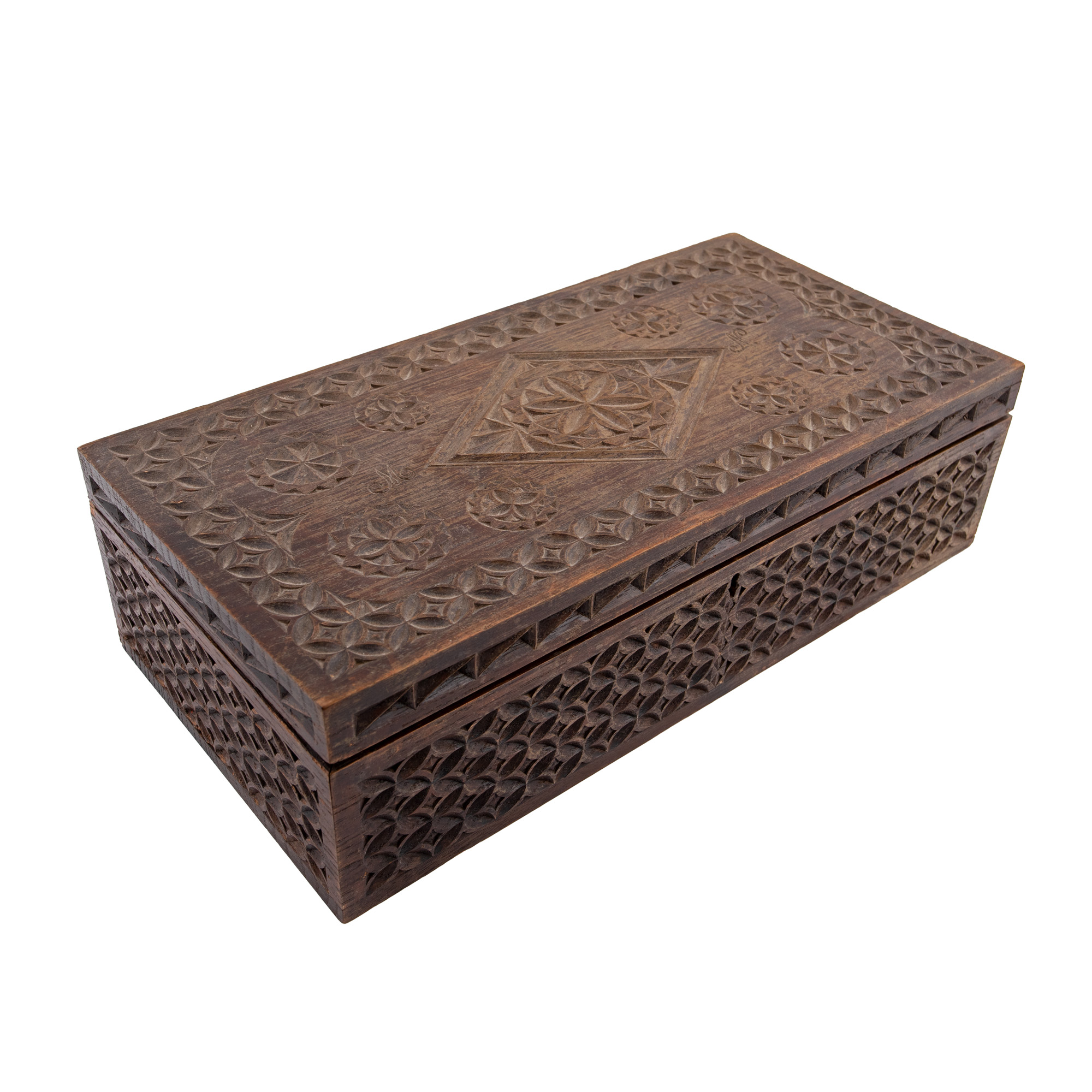 19. Cutie din lemn în stil Neo-Românesc, monogramată pe capac cu inițialele ”MN”, cca. 1920