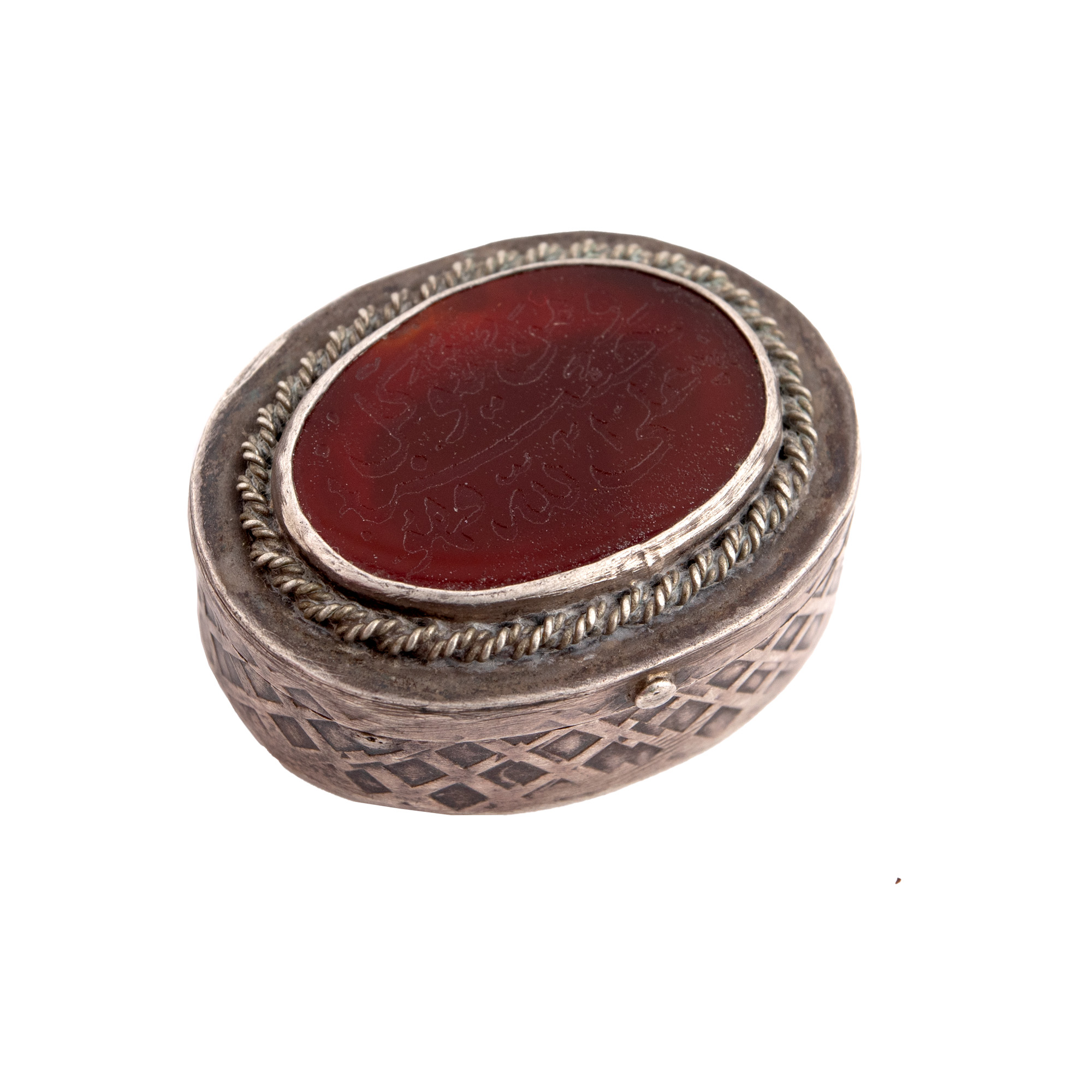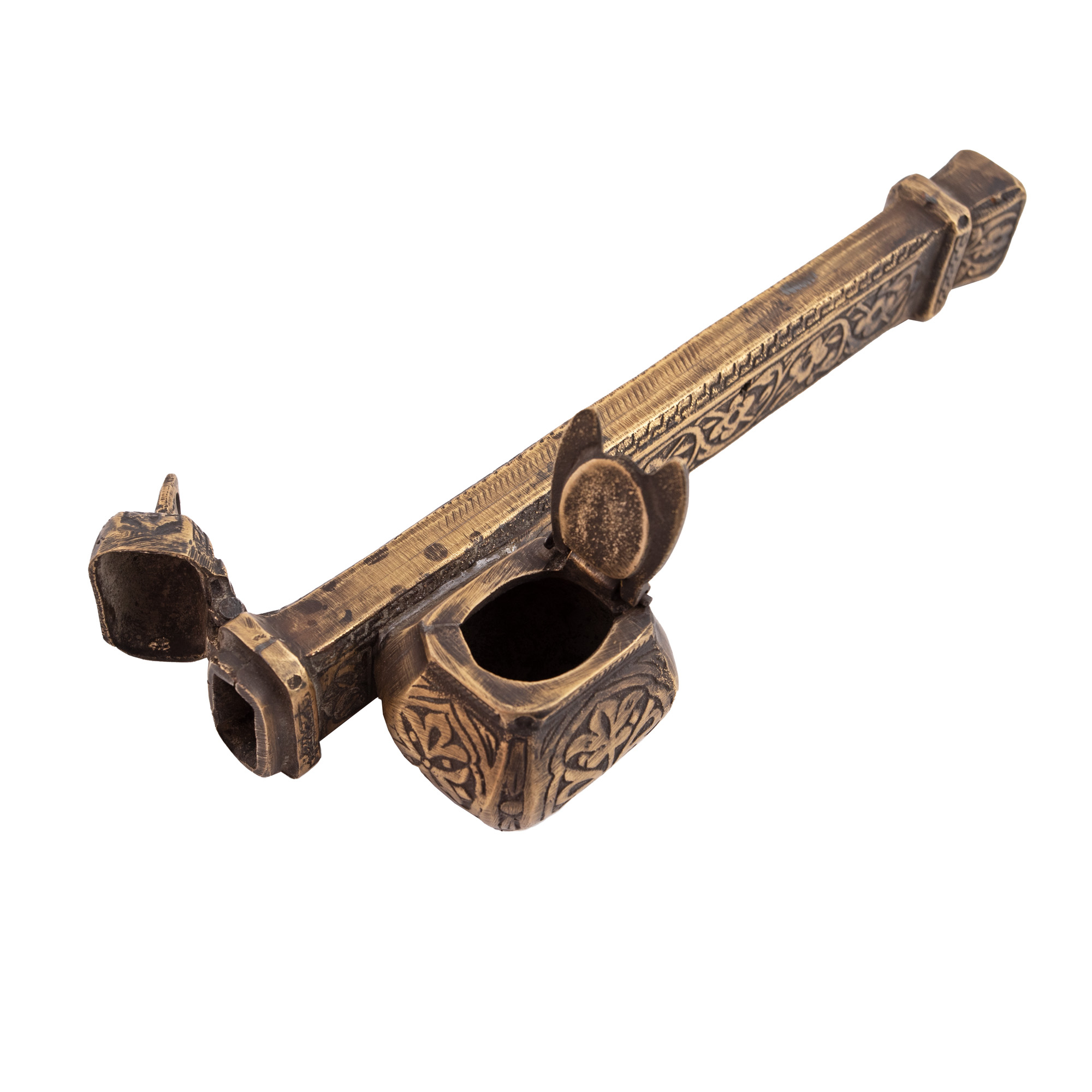 2. Călimară otomană de brâu, din bronz, decorată cu inscripții caligrafiate, sec. XIX