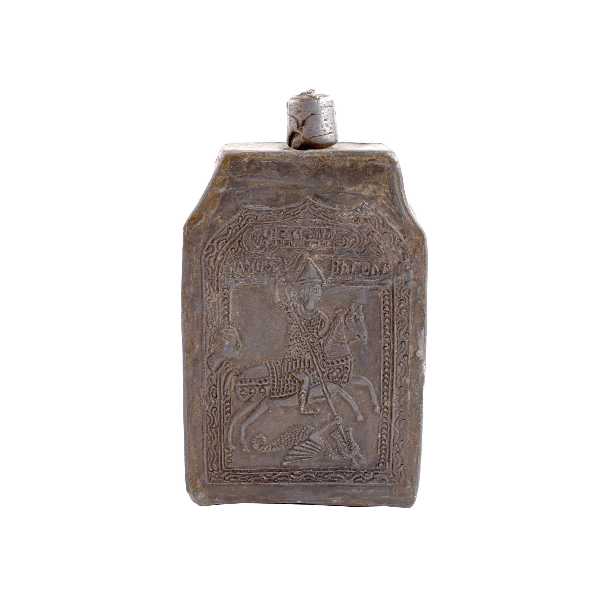 3. Ploscă din cositor, decorată cu ”Sfântul Gheorghe ucigând balaurul”, zona balcanică, datată 1828