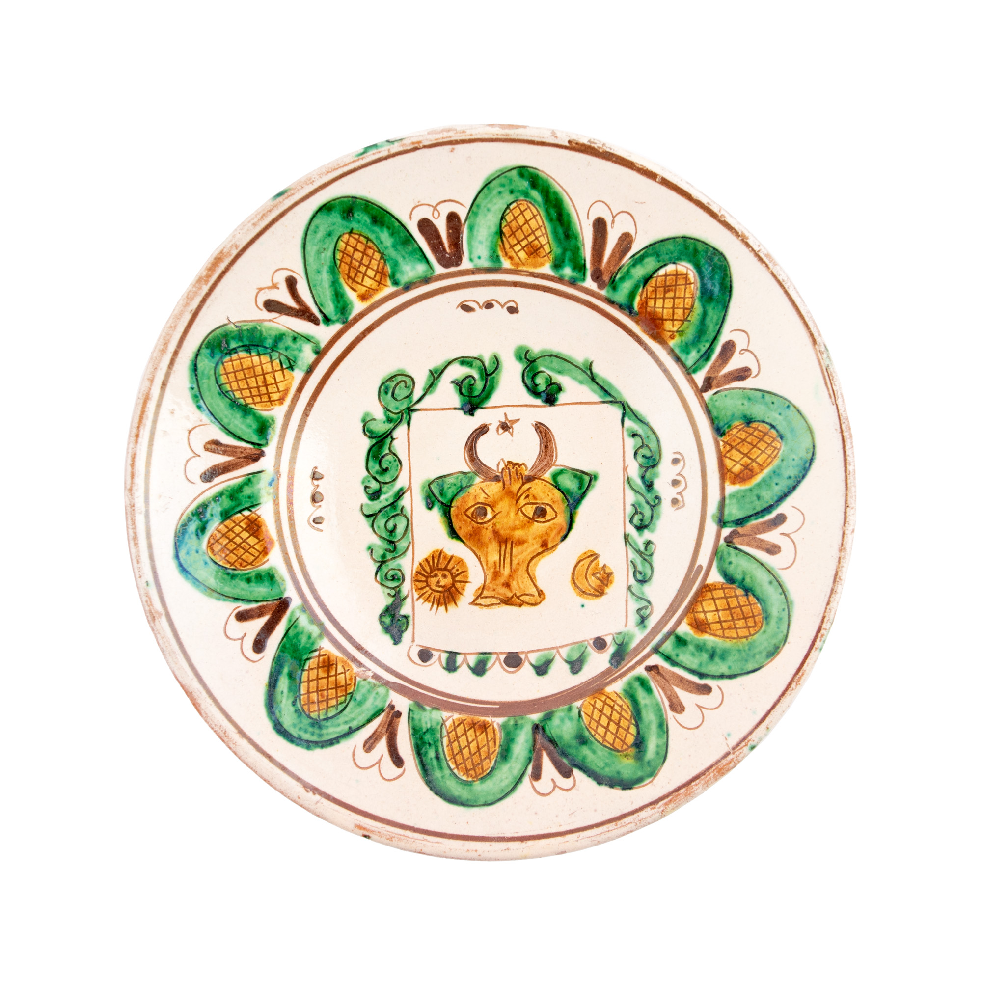 55. Farfurie decorativă tip Kuty, semnată Colibaba, decorată cu stema medievală a Moldovei, Rădăuți, prima jumătate a sec. XX