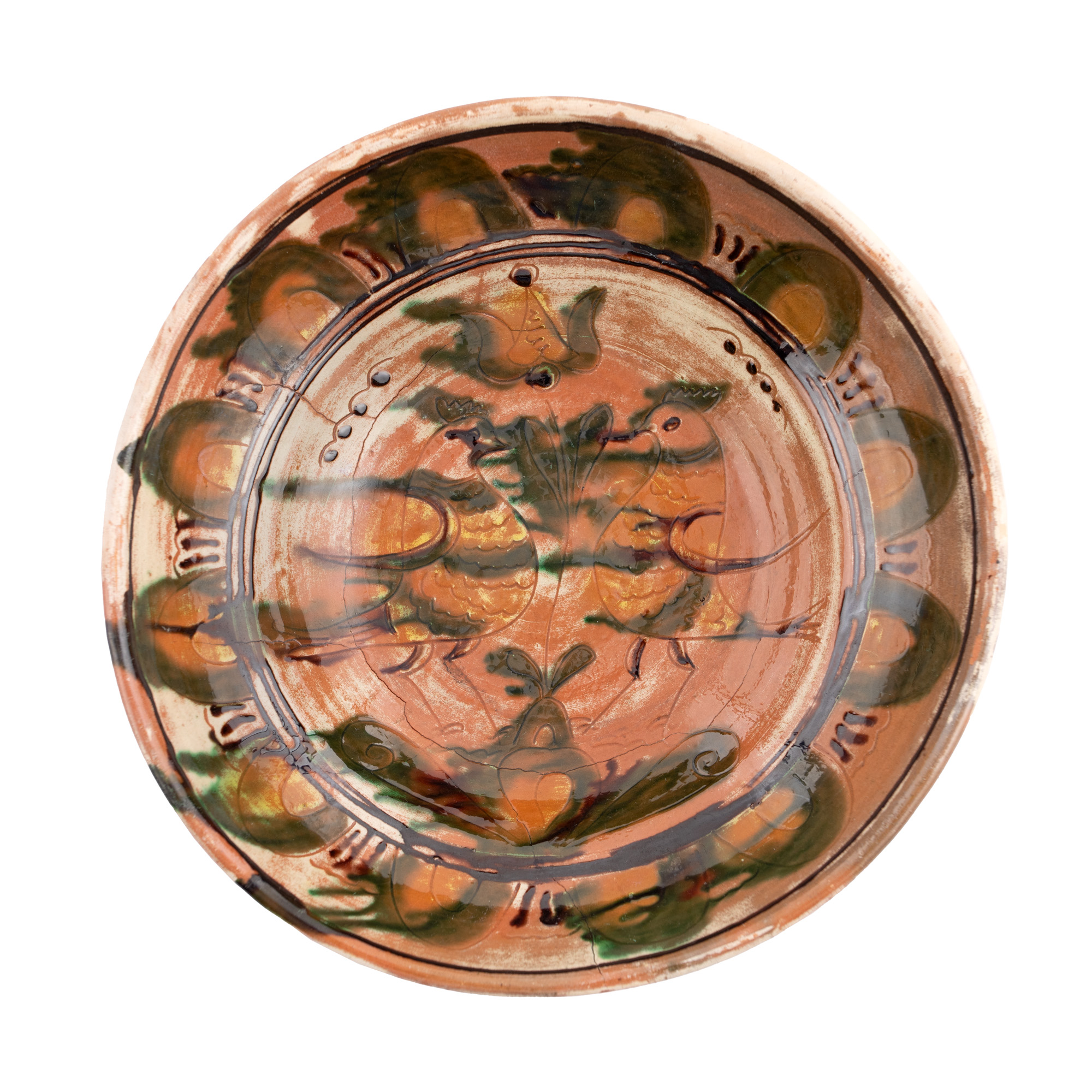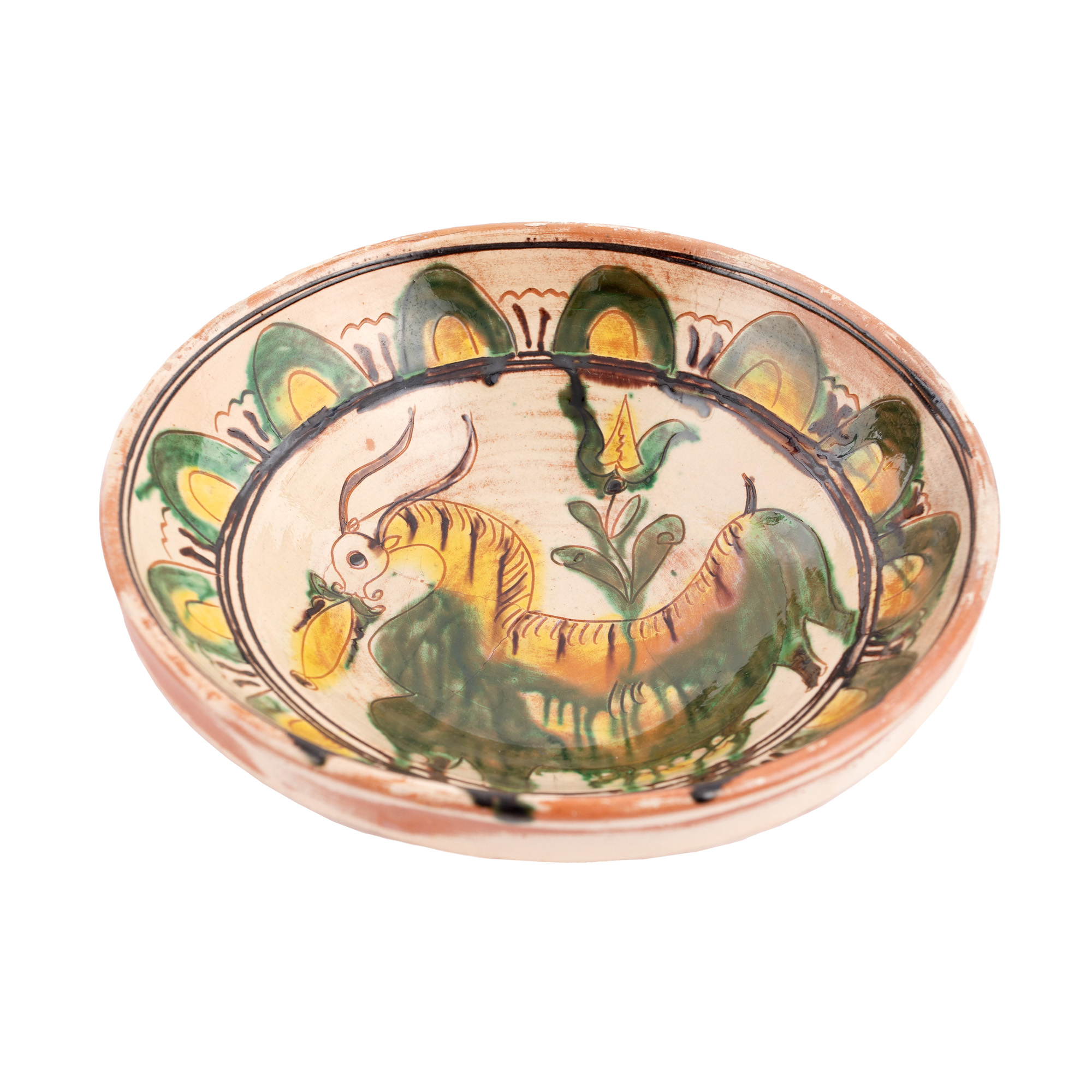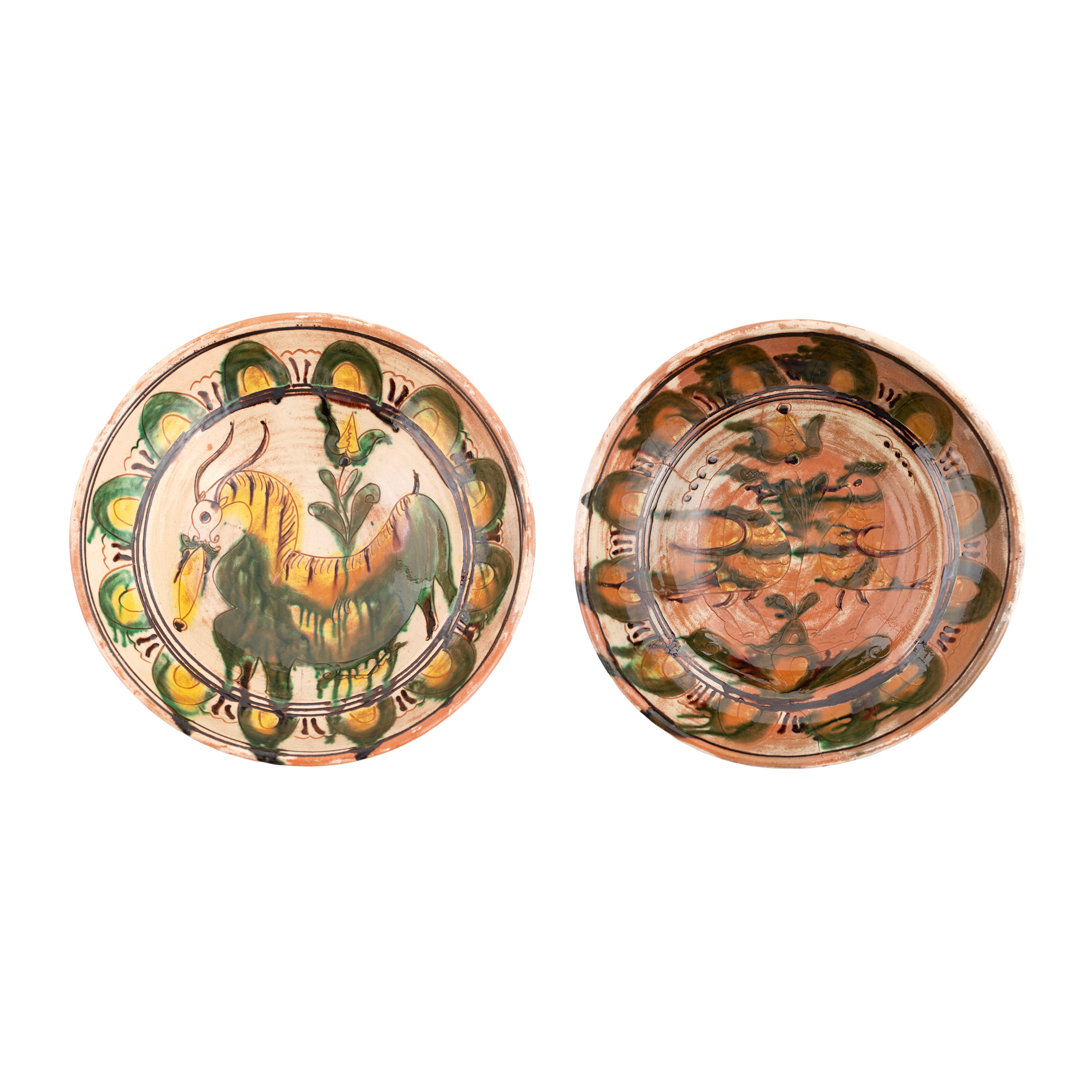 61. Lot format din două farfurii, decorate cu privighetori și țap, semnate Colibaba, Rădăuți, prima jumătate a sec. XX