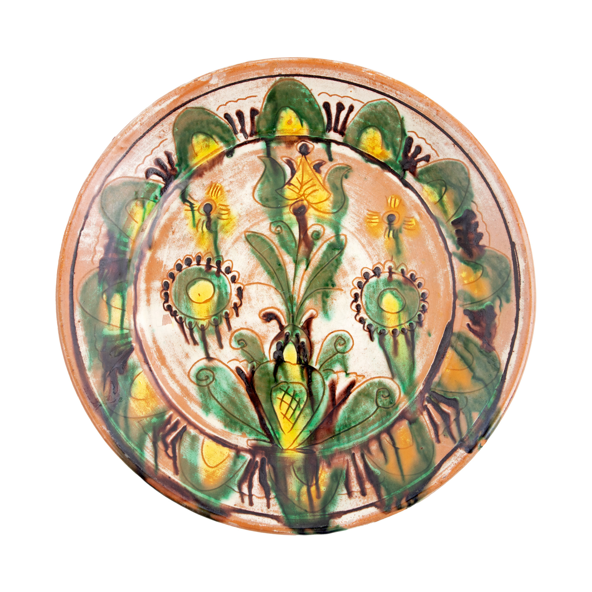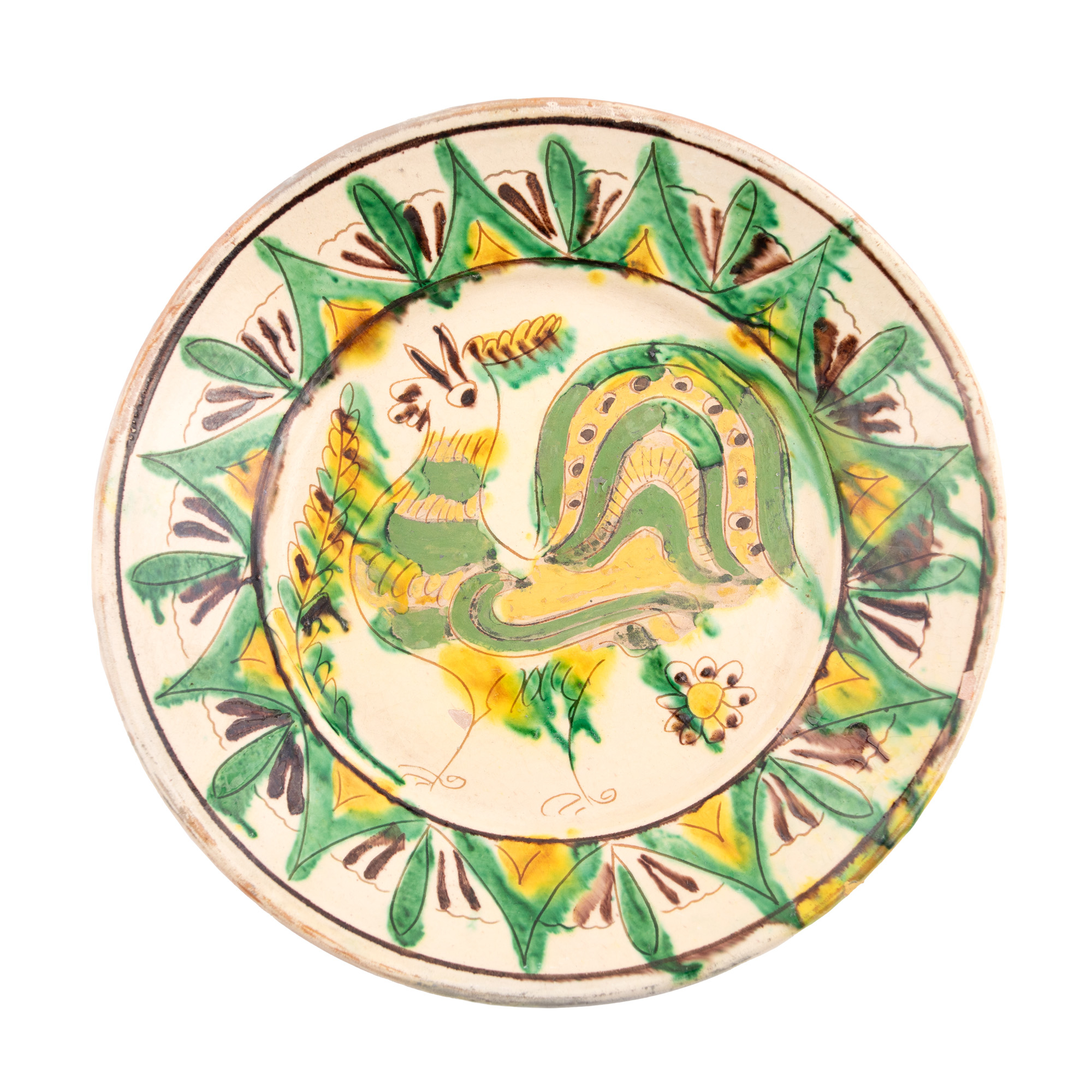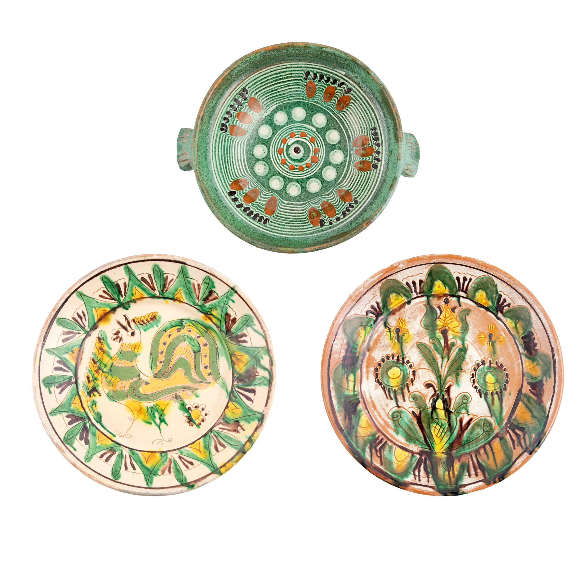 57. Lot format din trei farfurii, decorate cu motive florale și avimorfe, semnate Colibaba, Rădăuți, prima jumătate a sec. XX