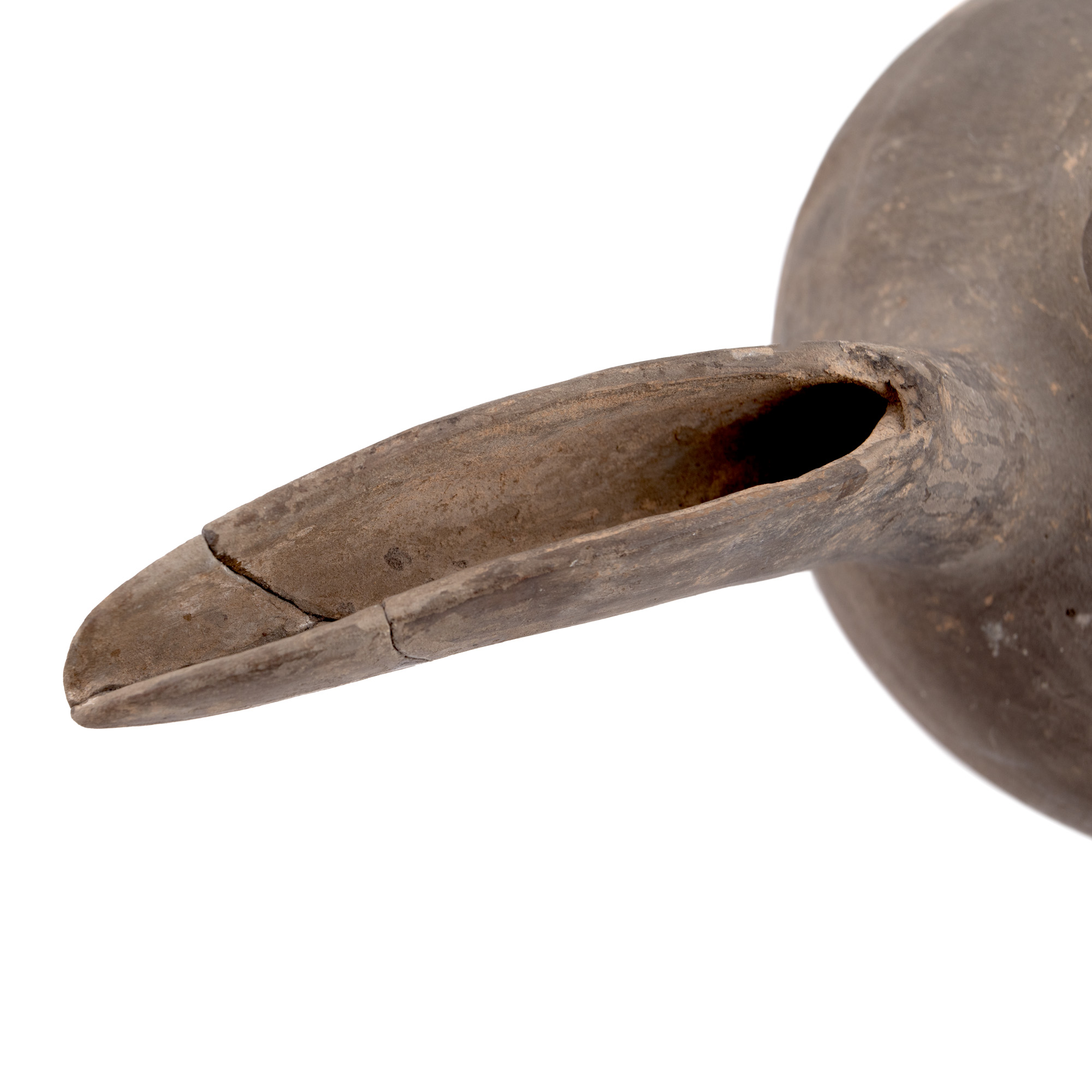 Vas din ceramică gri cu firnis negru diluat. Corp tronconic; cioc deversor alungit. în partea opusă, o toartă mică verticală. Baza plată.