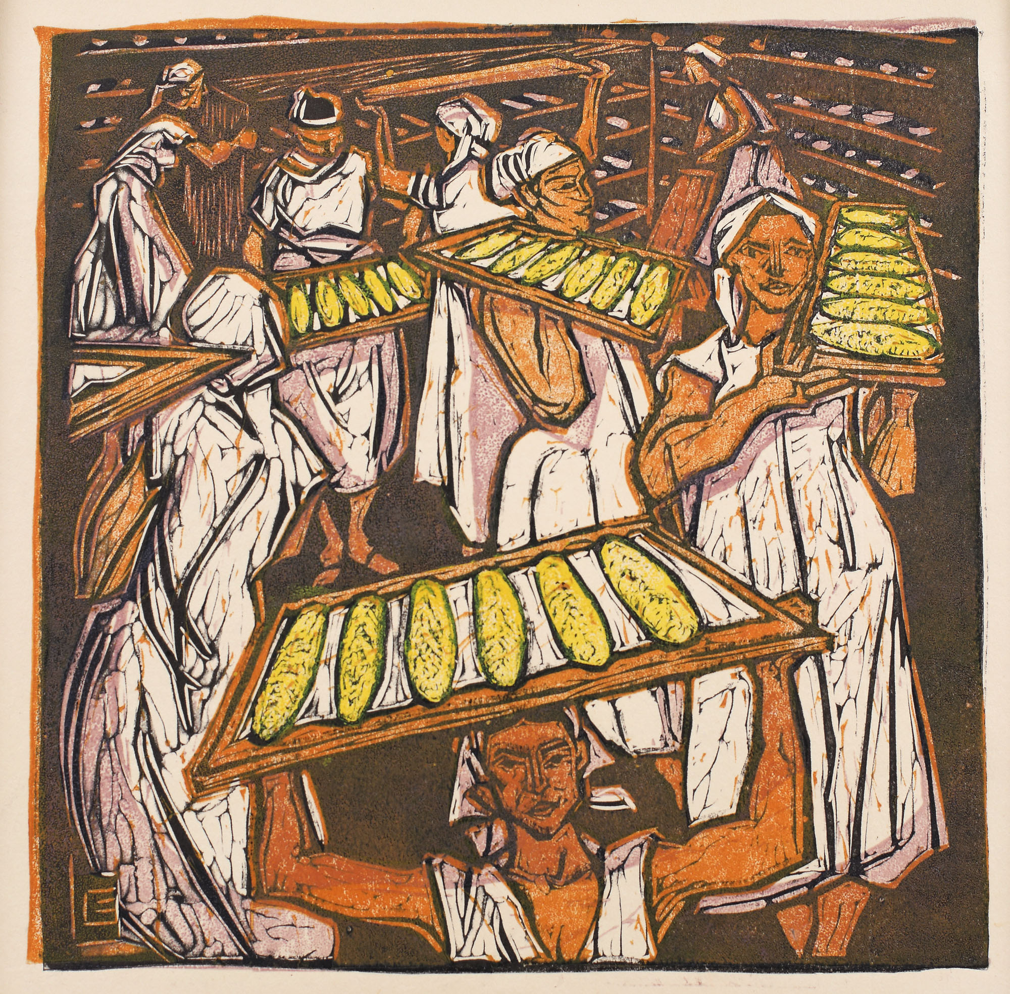 Opera este reprodusă în „Eva Cerbu”, Adrian Buga, Ed. Unarte, București, 2013, la p. 103, sub titlul „Tăvile cu pâine”. Lucrarea a făcut parte din expoziția retrospectivă "Eva Cerbu - Carusel", la Muzeul Național al Țăranului Român, București, iunie-iulie 2016. O variantă a operei este reprodusă în revista Contemporanul, București, 11 decembrie 1958, sub titlul "La fabrica de pâine". O variantă a operei a făcut parte din expoziția personală de la Galeria Simeza, București, aprilie-mai 1959 și este reprodusă în catalogul expoziției,