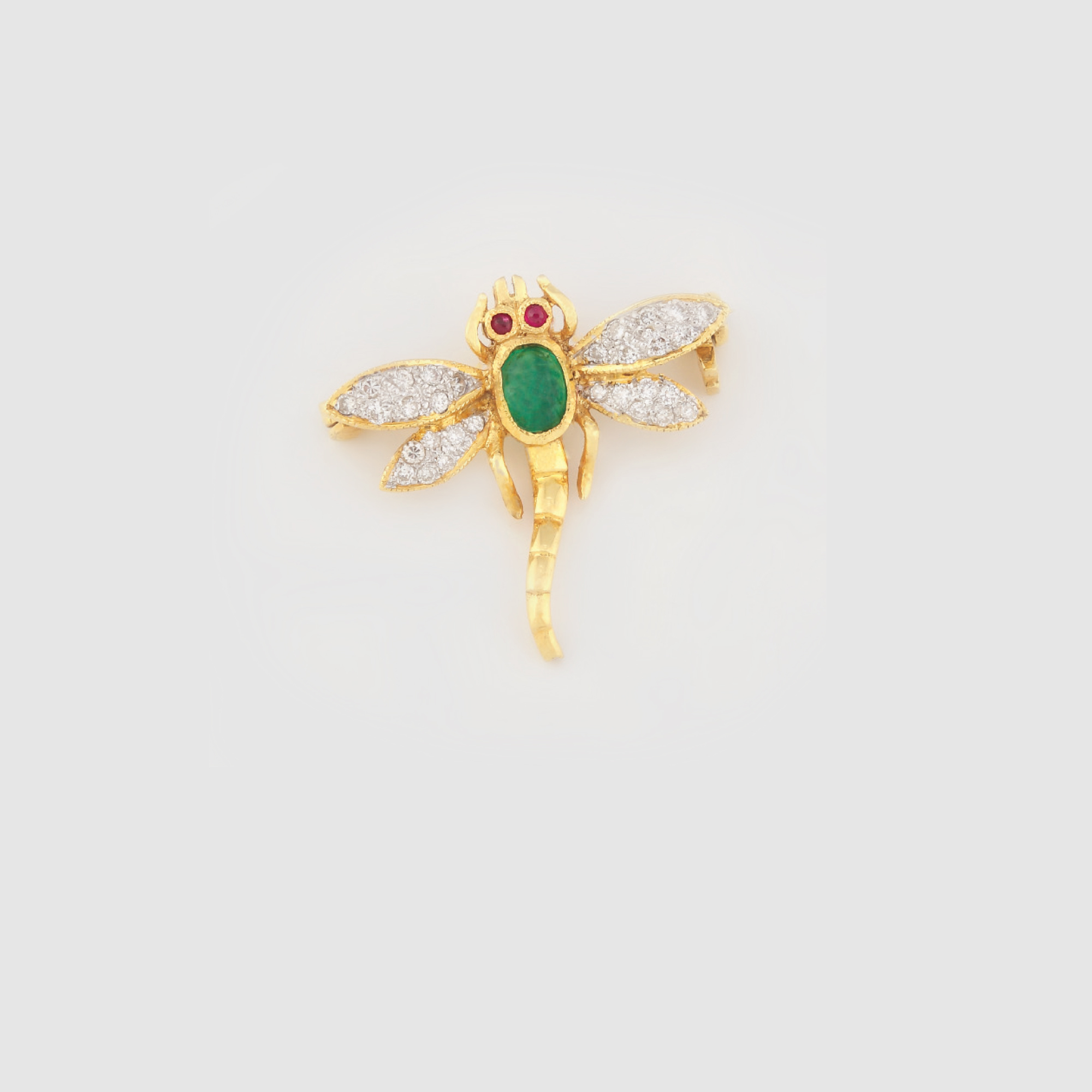 417. Delicată broșă din aur, în forma unei libelule, decorată cu diamante, smarald și rubine
