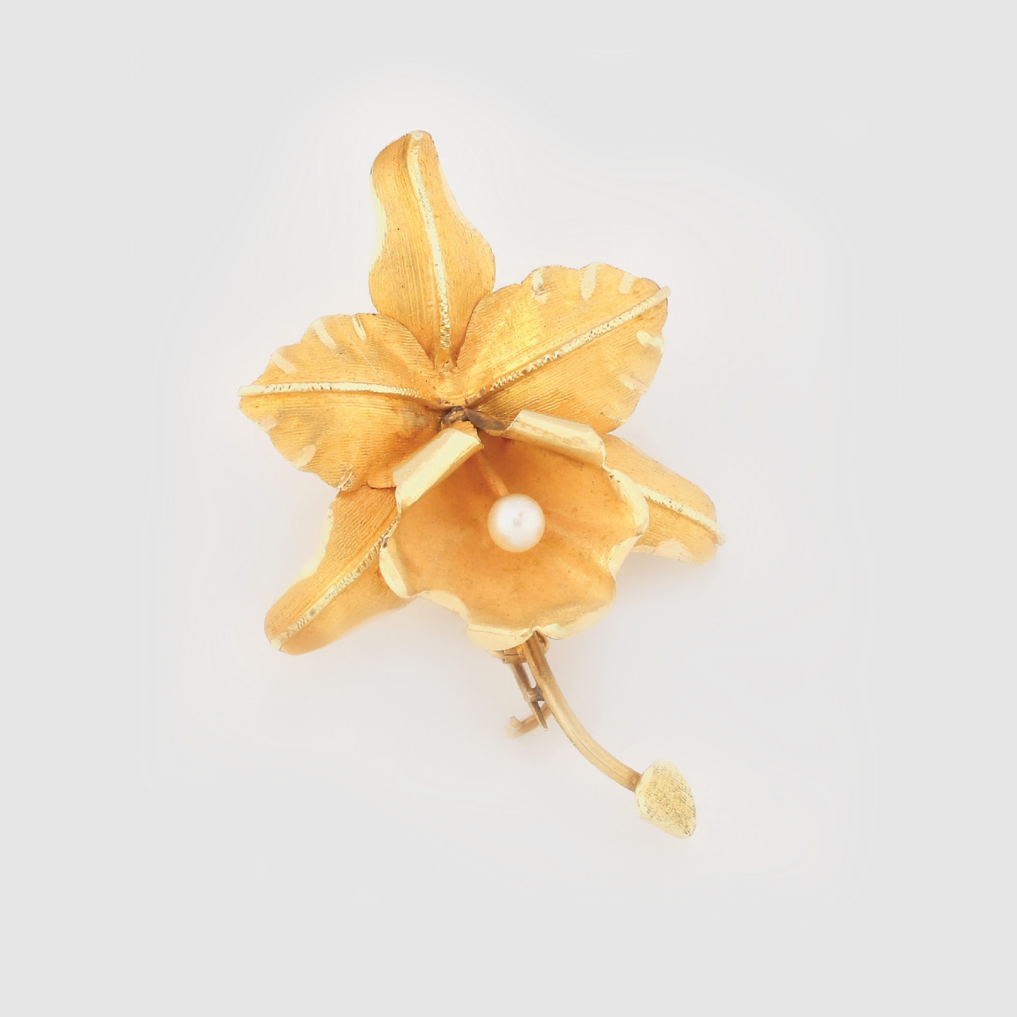 425. Broșă din aur, în formă de floare, decorată cu perlă