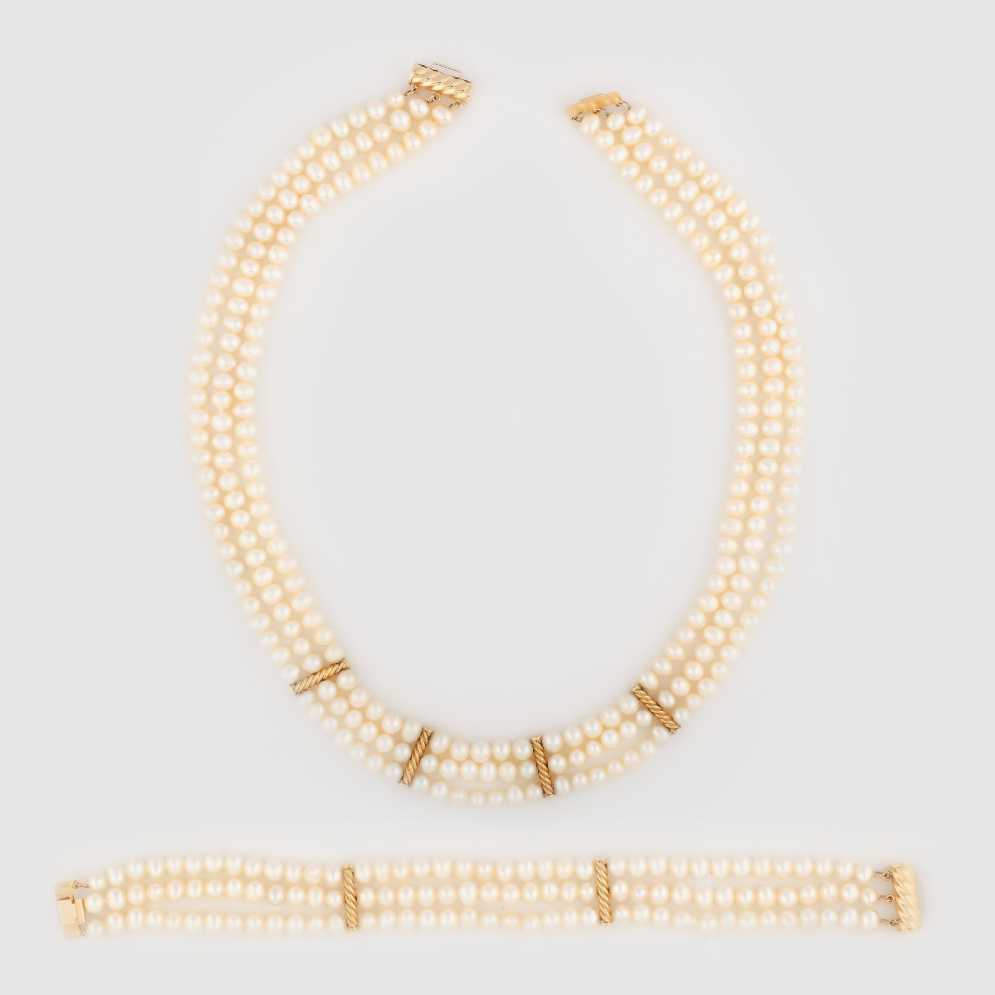 430. Elegant set format din colier și brățară din șiruri de perle cu torsade din aur