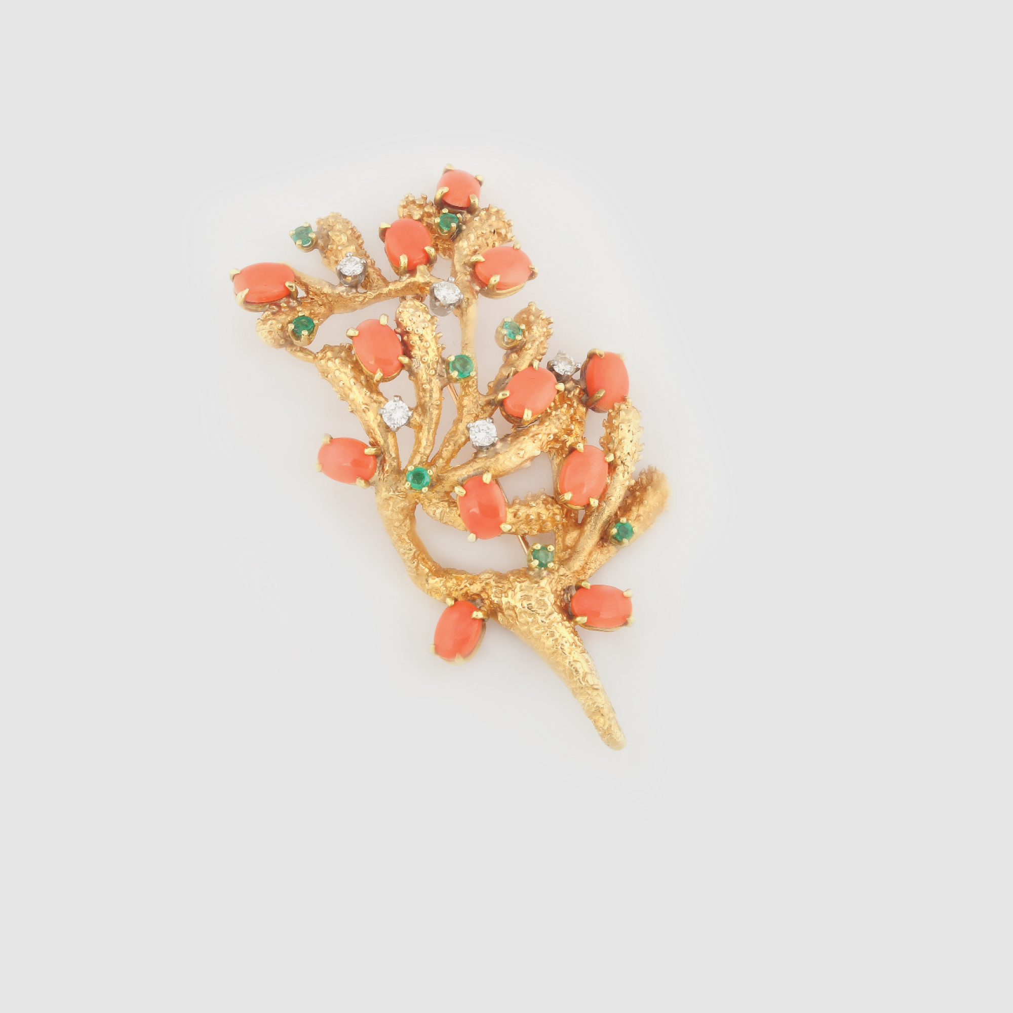 432. Formidabilă broșă din aur, decorată cu diamante, corale și smaralde
