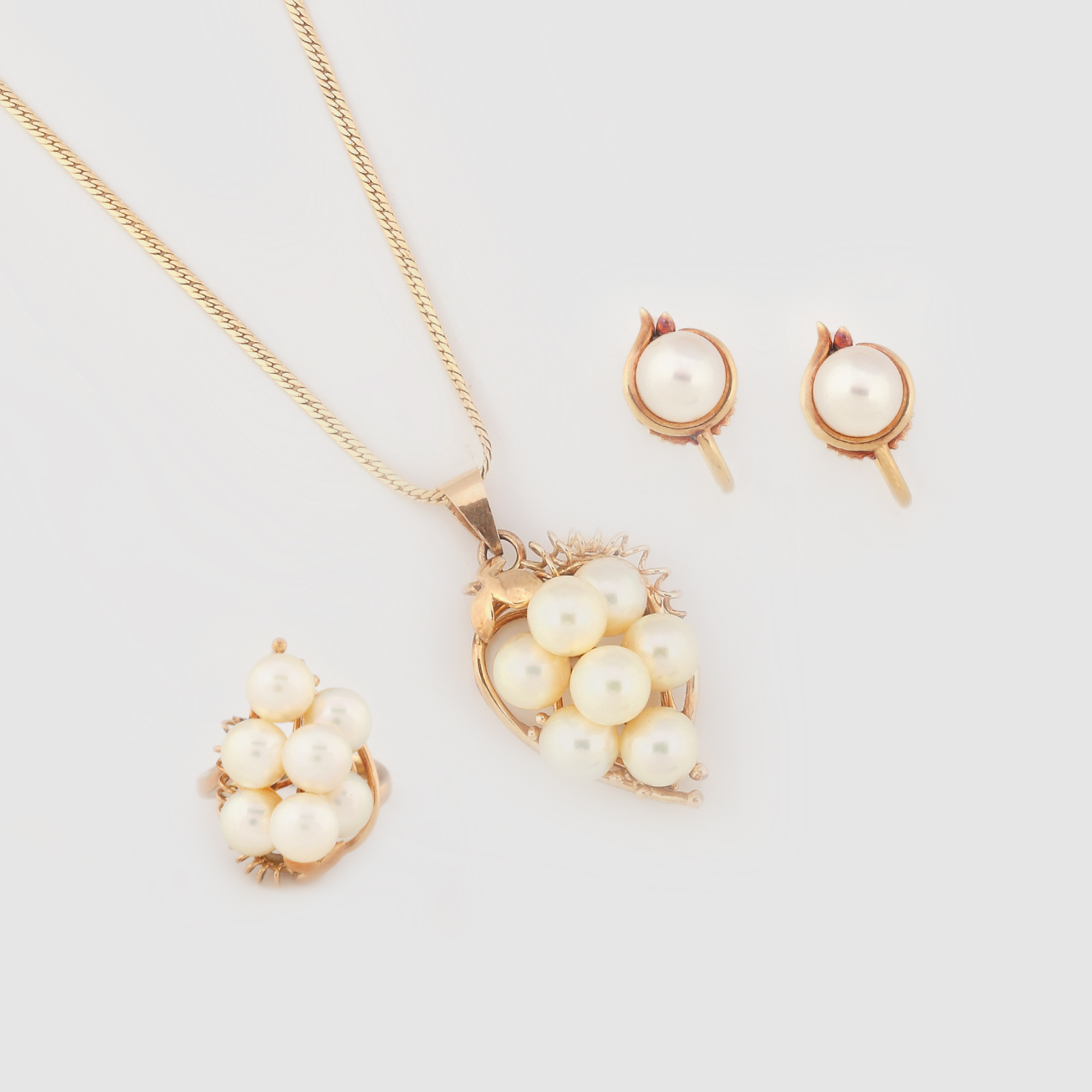 433. Set format din inel, pereche de cercei și lanț cu pandantiv, din aur, decorat cu perle