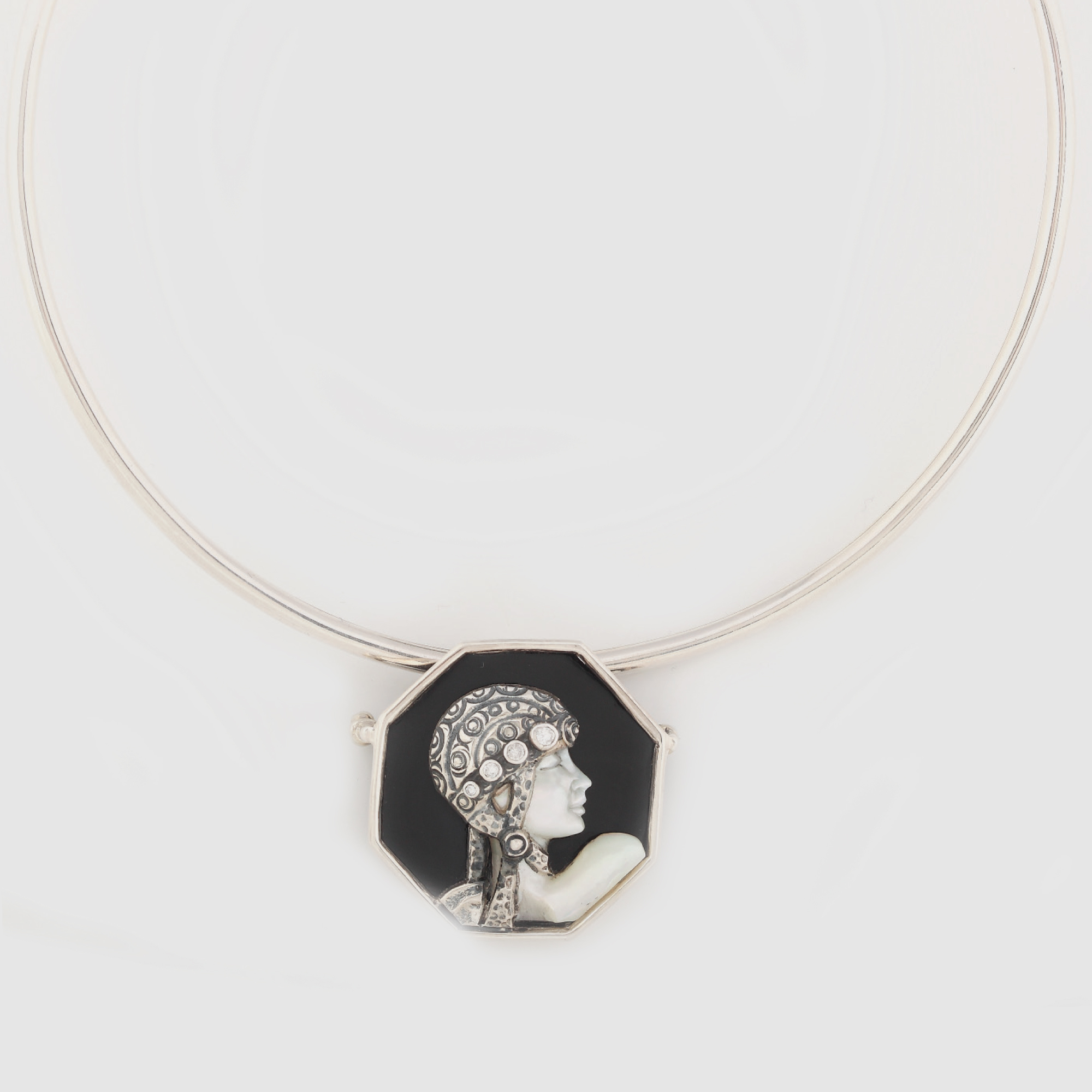 435. Colier din argint, decorat în manieră Art Deco, cu profil de dansatoare și sidef