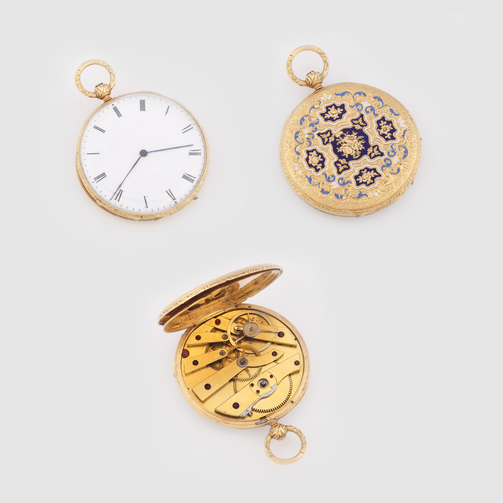 443. Ceas de buzunar, din aur, bogat decorat cu email, cu cheie, sfârșitul sec. XIX