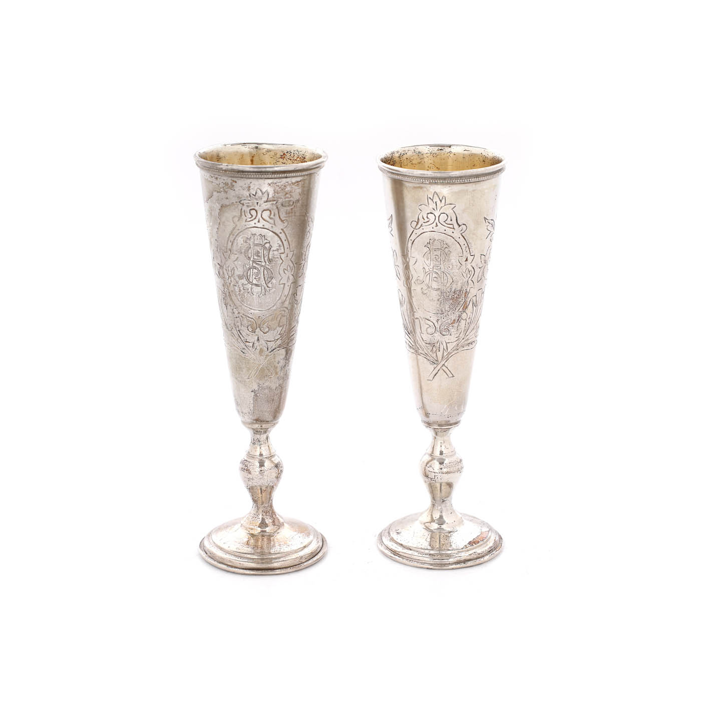 16. Pereche de flute miniaturale din argint, gravată cu monograme și modele florale, 1893-1897