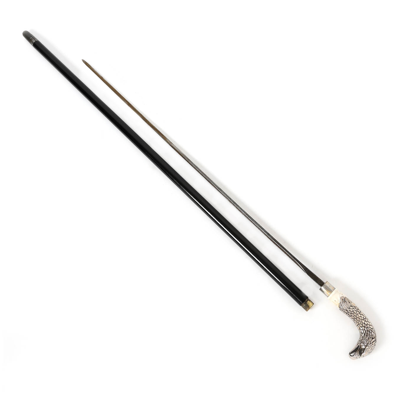 31. Baston ascunzând un stilet, cu mâner din argint în forma unui cap de vultur, sfârșitul sec. XIX, piesă de colecție