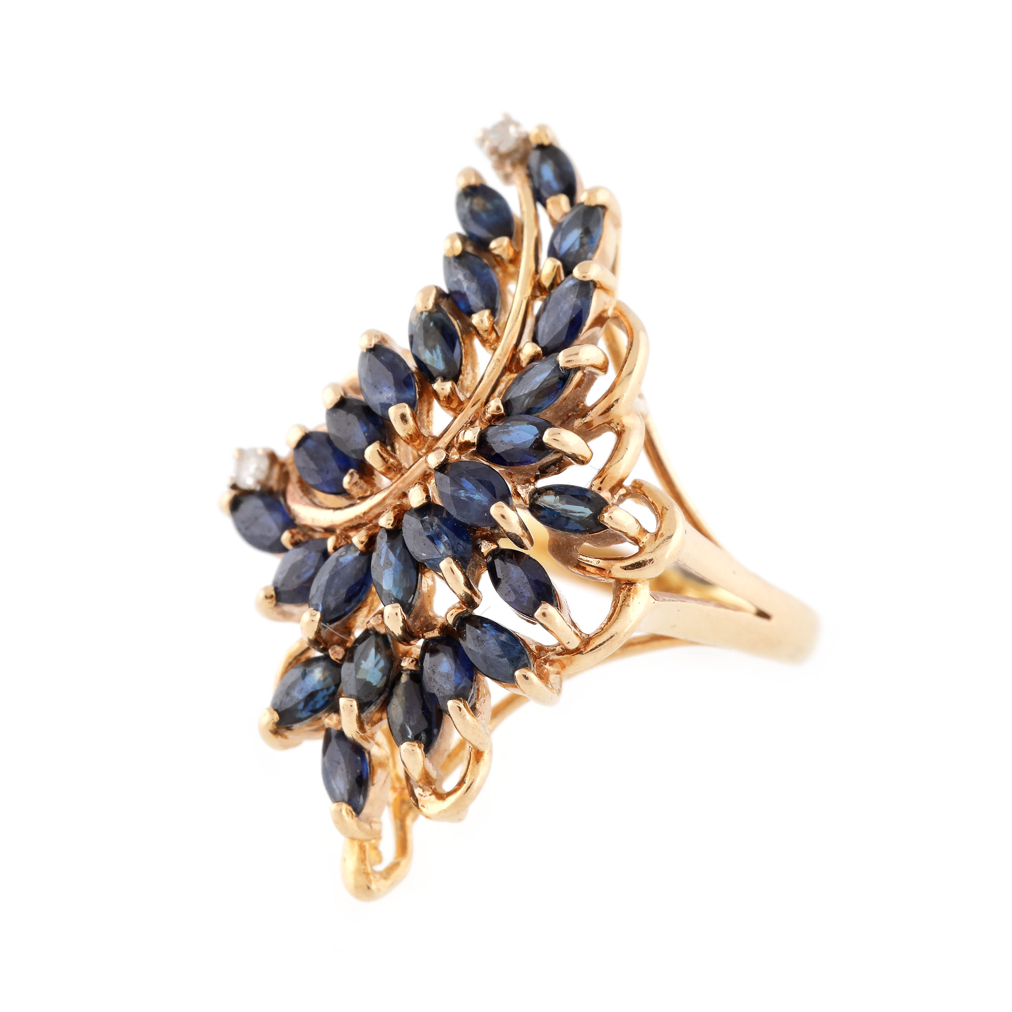 25 safire marchiz fațetate, culoare albastru, claritate SI, cca. 1,9 ct. și 2 diamante rotunde briliant, culoare K-L, claritate I2, cca. 0,02 ct.