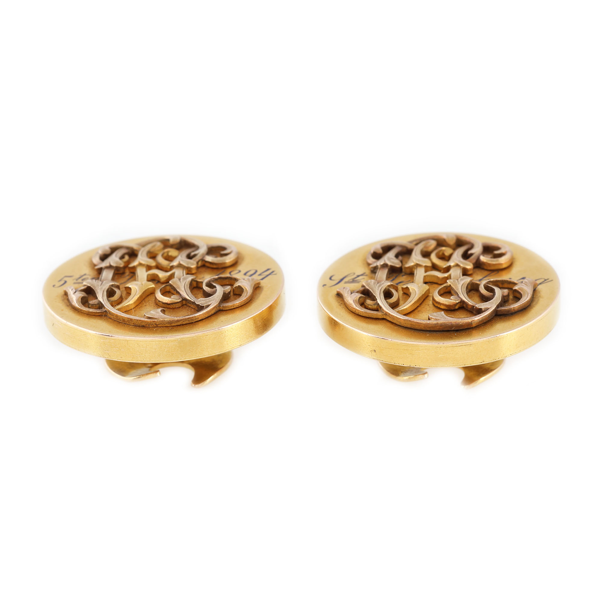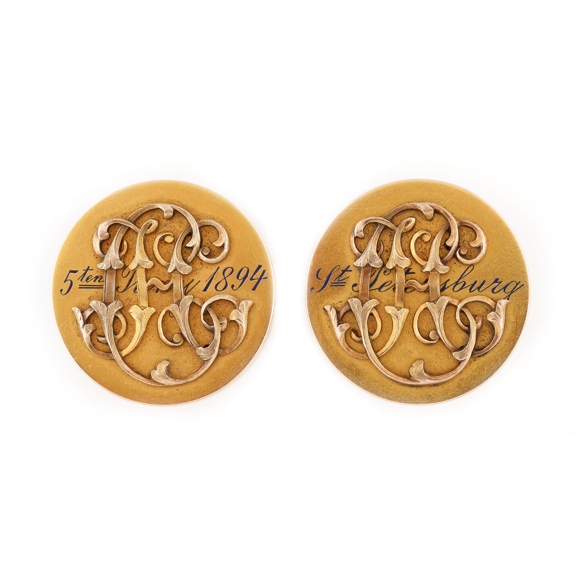 39. Pereche de butoni Nichols & Plinke, din aur, monogramată, probabil realizată pentru un prinț din suita Casei Imperiale Rusești, 1894