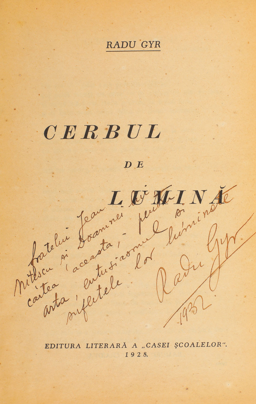116. "Cerbul de lumină", de Radu Gyr, Bucureşti, 1928, cu dedicaţia autorului către pictorul Jean Nițescu