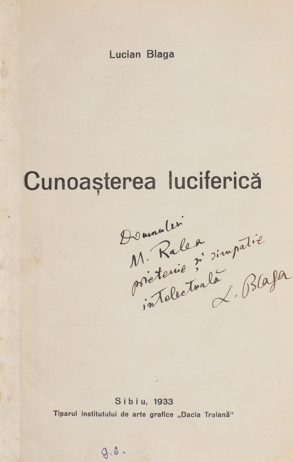119. "Cunoașterea luciferică" de Lucian Blaga, Sibiu, 1933, cu dedicația autorului către Mihail Ralea