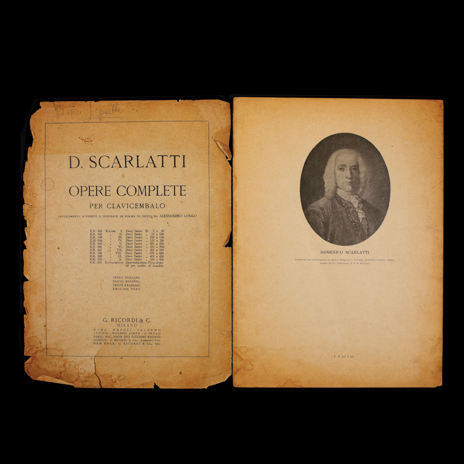 128. ”Opere complete pentru clavecin”, de Domenico Scarlatti, Milano, cu semnătura olografă a lui Dinu Lipatti (7 file)