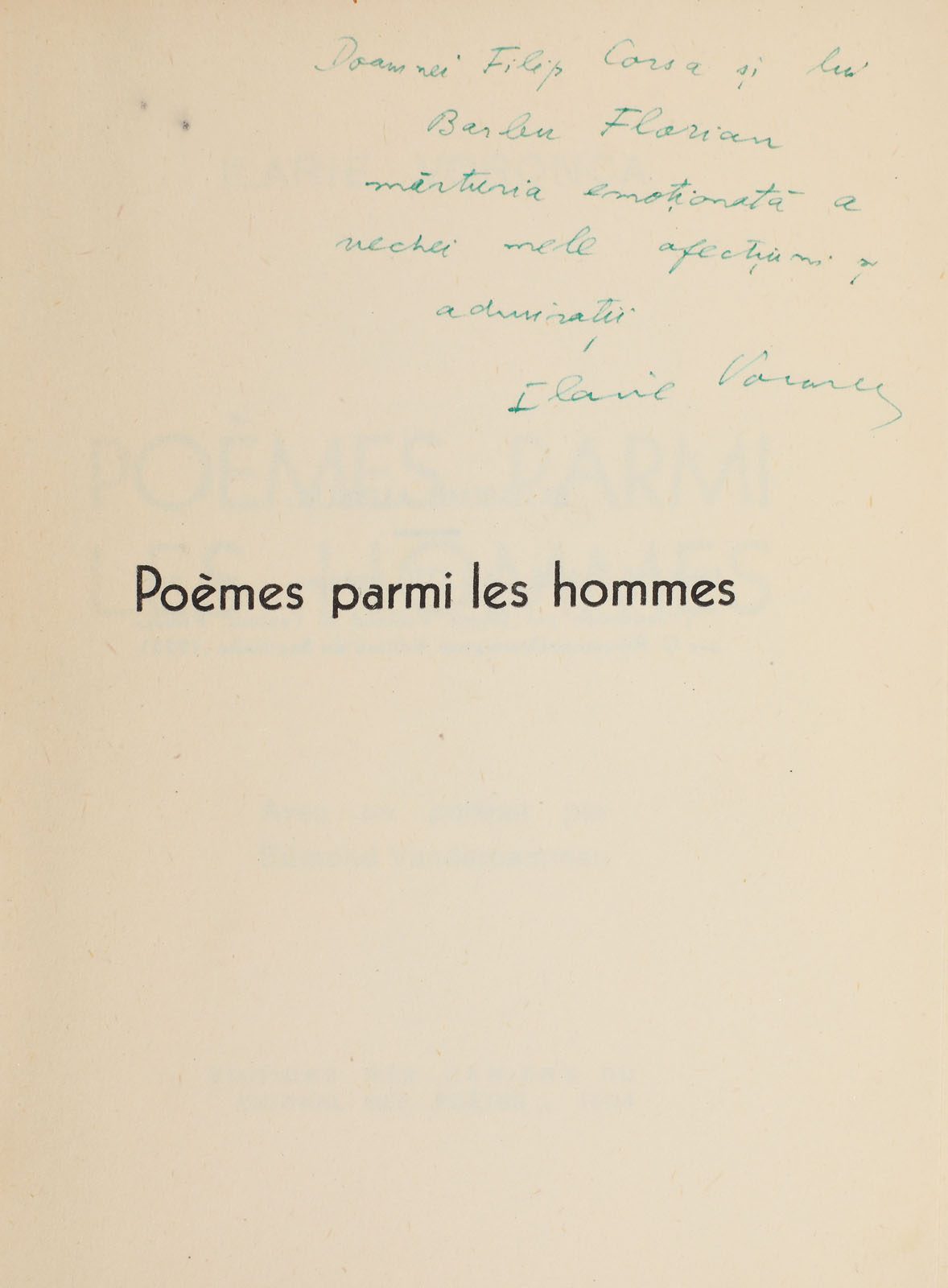 115. ”Poezii printre oameni”, de Ilarie Voronca, franceză, Paris, 1934, cu dedicația și semnătura olografă a autorului către poeta avangardistă Filip Corsa (alias Diane de Poitiers) și scriitorul avangardist Barbu Florian