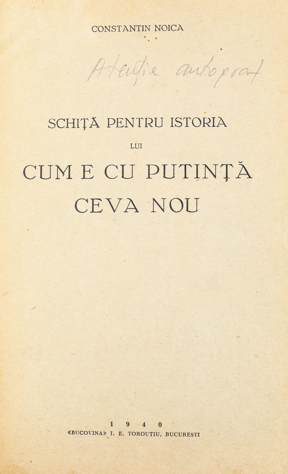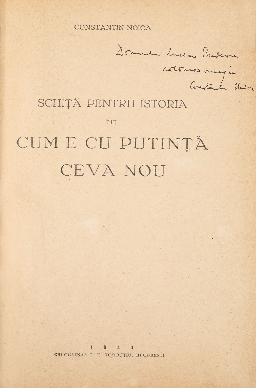 110. ”Schiță pentru istoria lui Cum e cu putință ceva nou”, de Constantin Noica, București, 1940, cu dedicația olografă a autorului către istoriograful Lucian Predescu