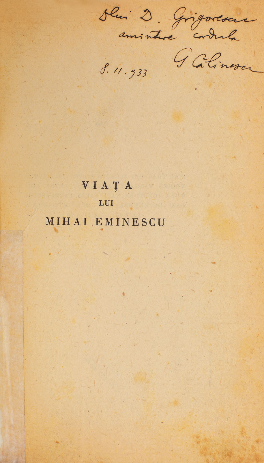 118. "Viaţa lui Mihai Eminescu", de George Călinescu, Bucureşti, 1932, cu dedicaţia și semnătura olografă a autorului