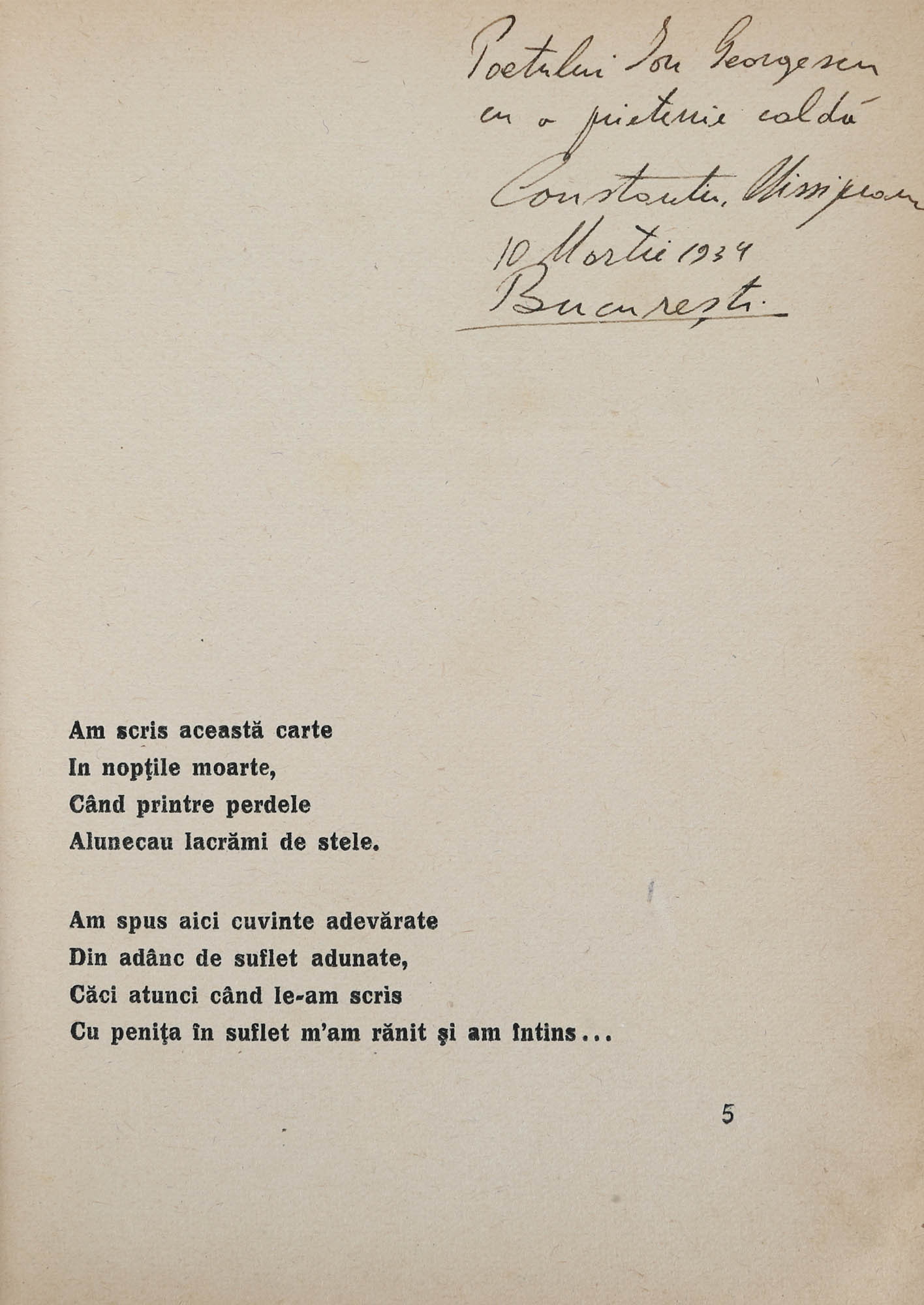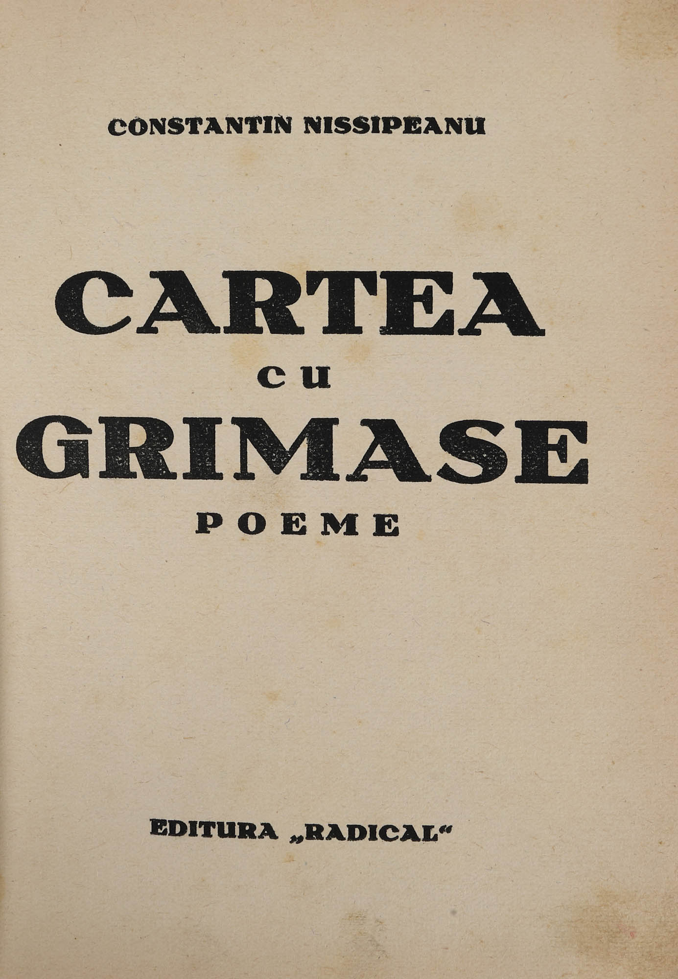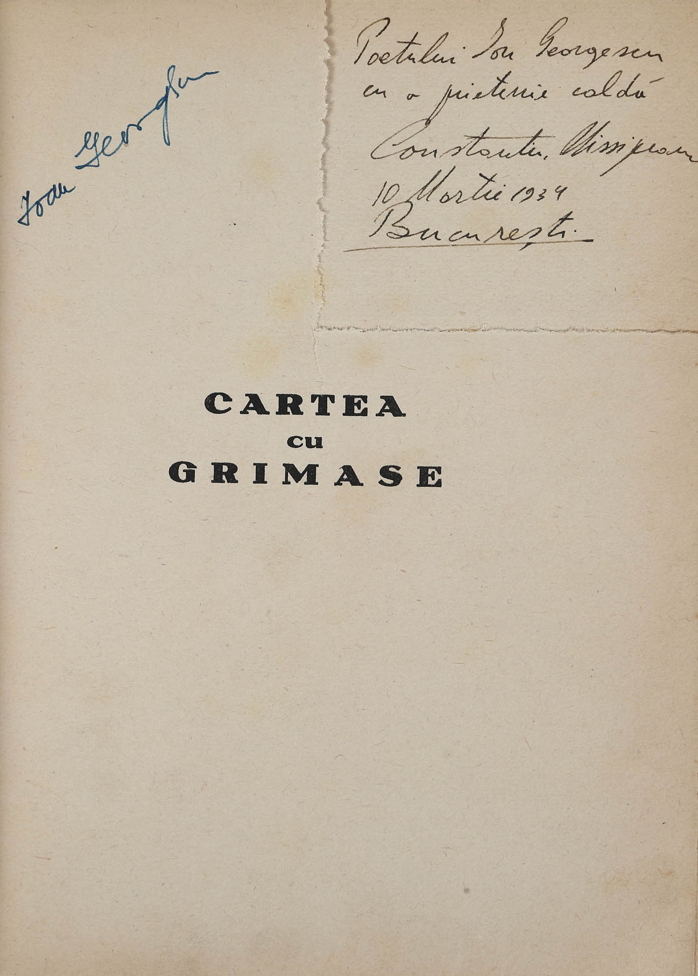 32. ”Cartea cu grimase”, de Constantin Nisipeanu, București, 1933, cu dedicația și semnătura olografă a autorului către poetul Ion Georgescu