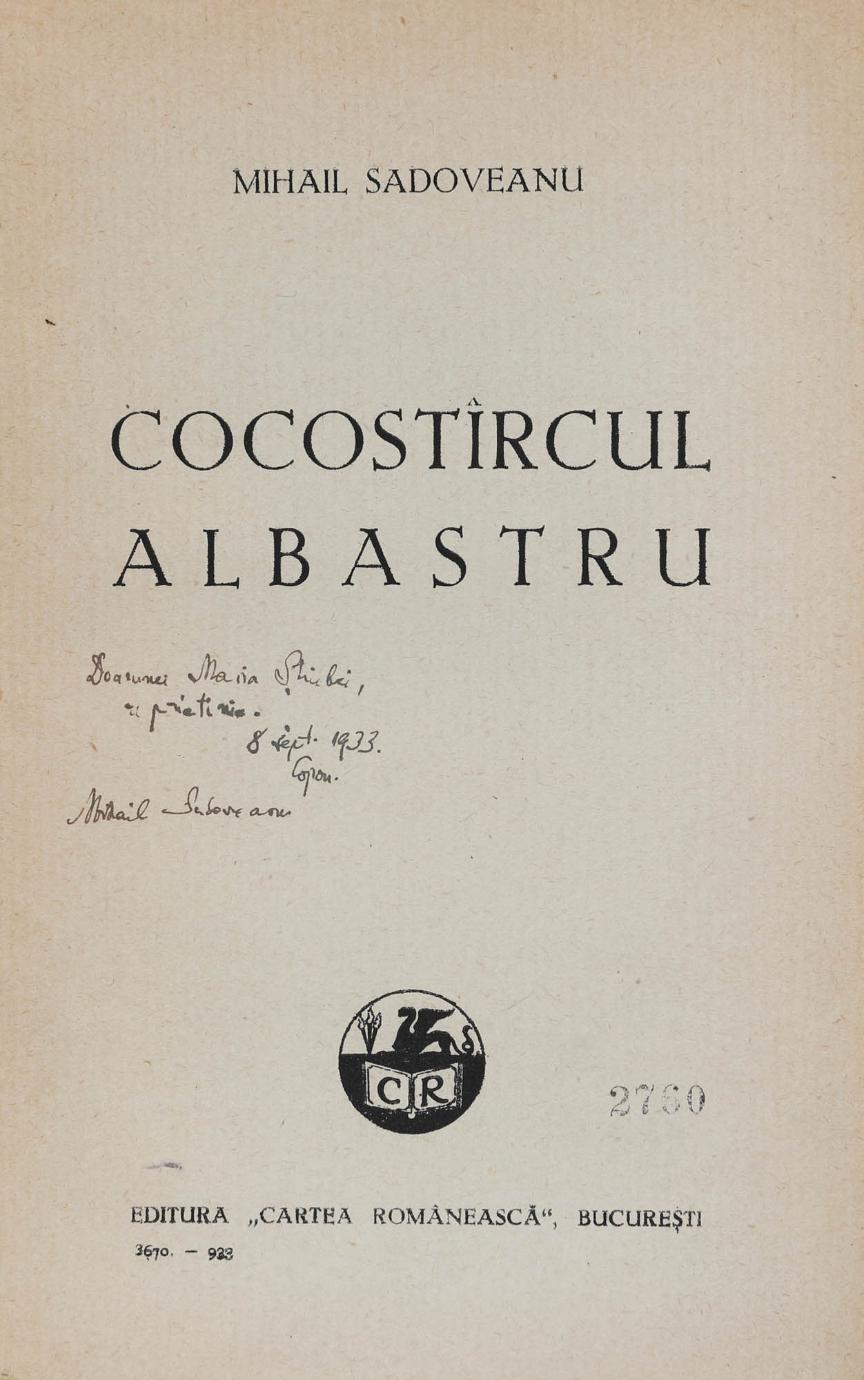 20. ”Cocostârcul albastru”, de Mihail Sadoveanu, București, 1933, cu dedicația și semnătura olografă a autorului către Maria Știubei
