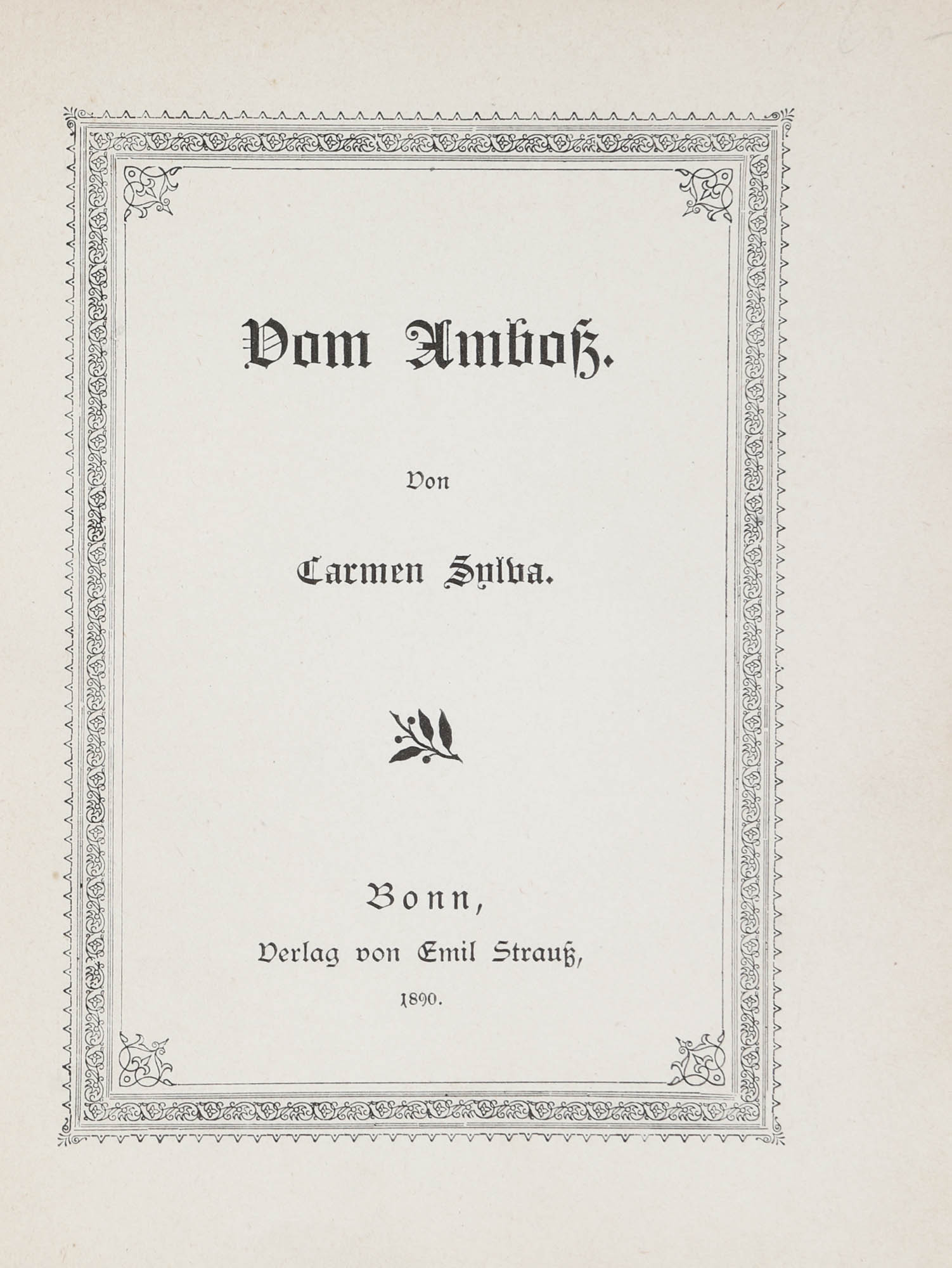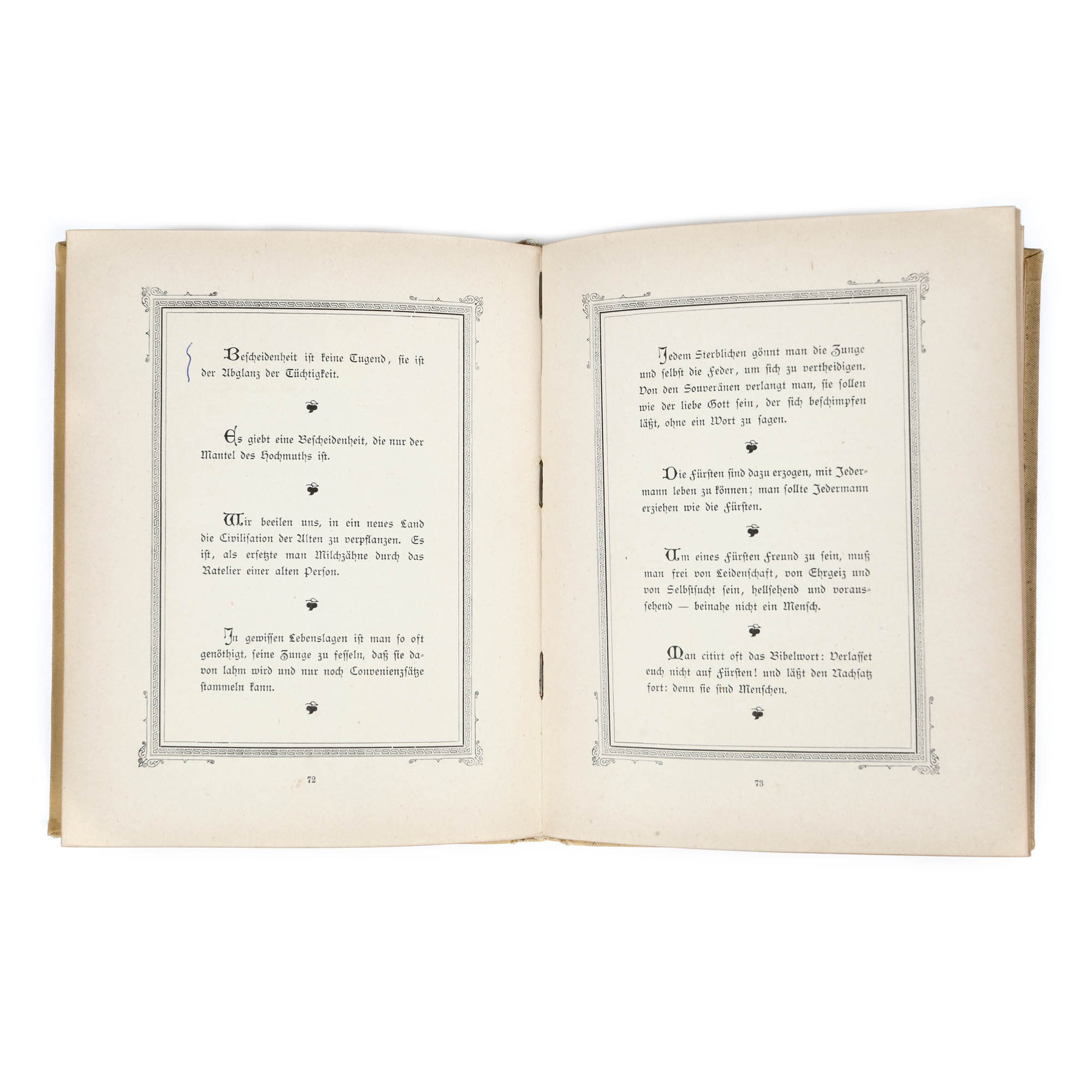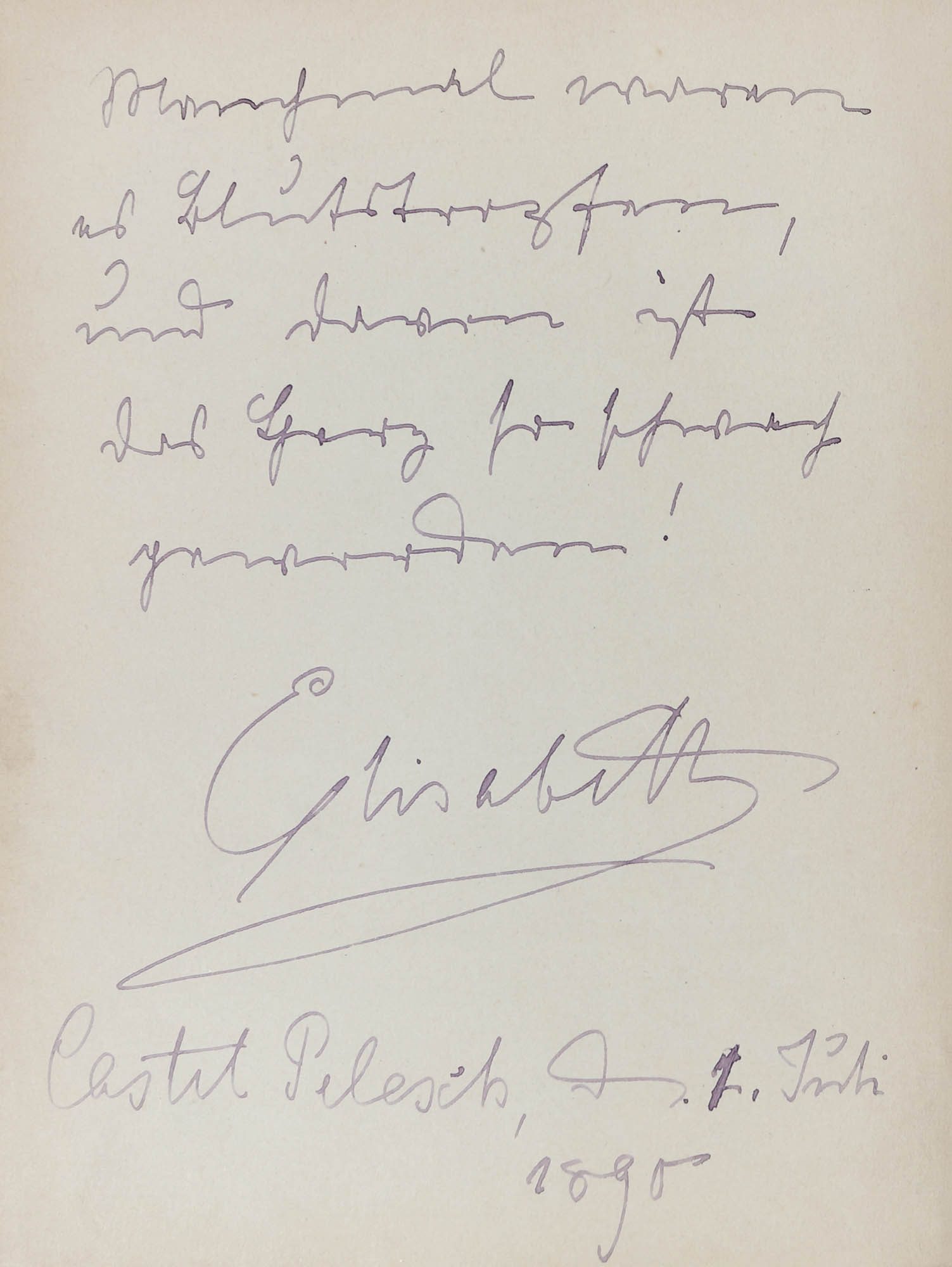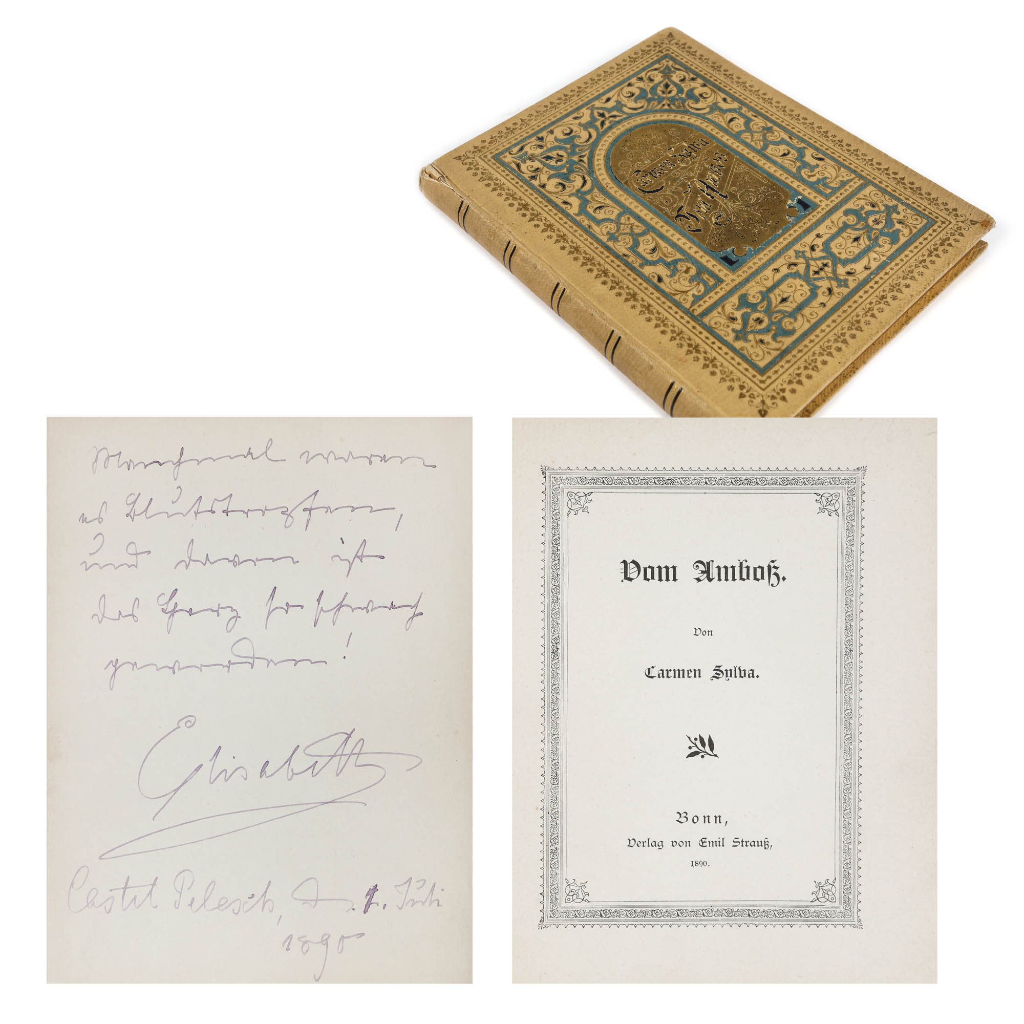 38. "Din cugetările unei regine", de Carmen Sylva, germană, Bonn, 1890, cu dedicația și semnătura olografă ale reginei, oferite la Castelul Peleș