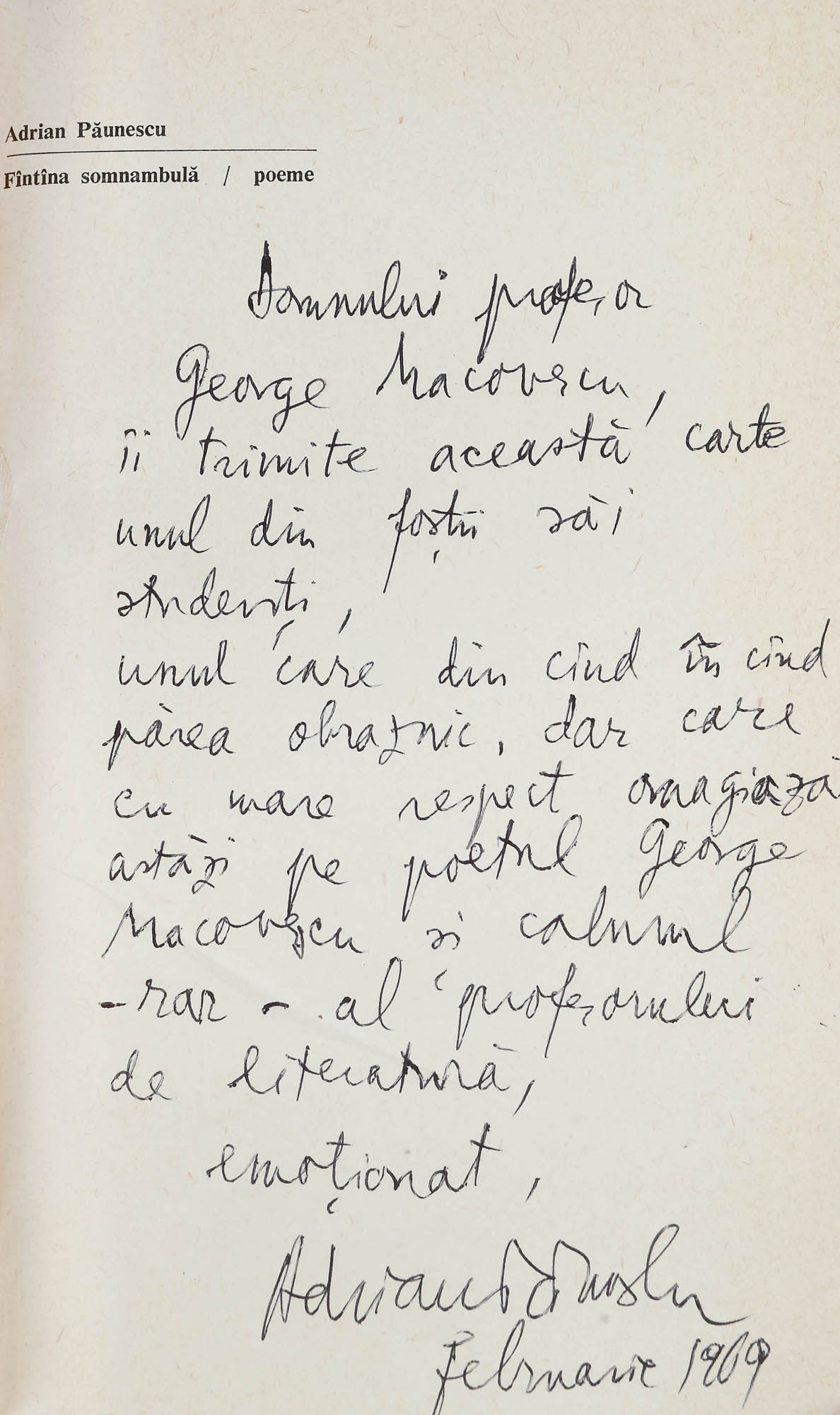 24. ”Fîntîna somnambulă”, de Adrian Păunescu, București, 1968, cu dedicația și semnătura olografă a autorului către George Macovescu, provine din colecţia fostului ministru de externe George Macovescu
