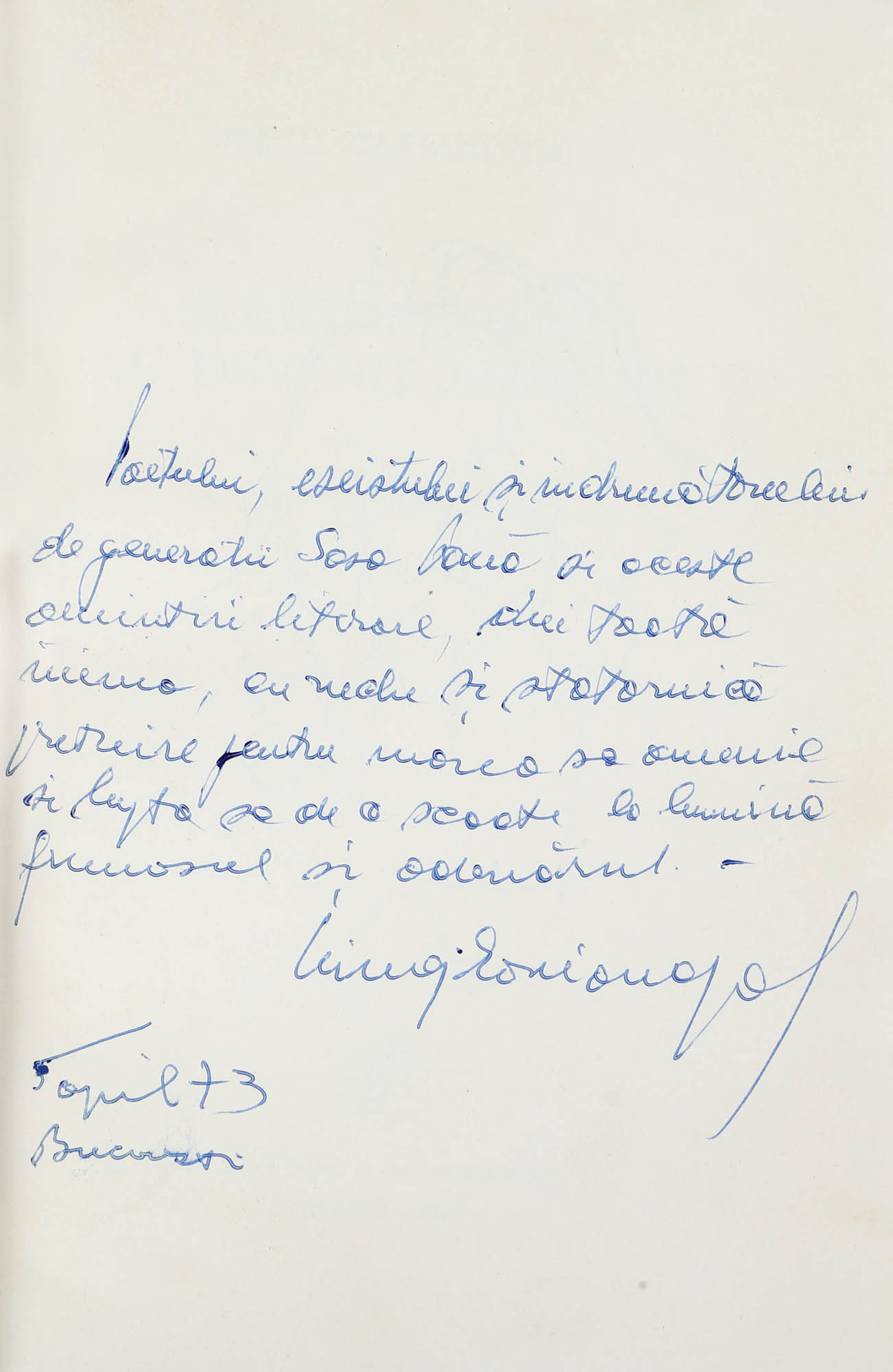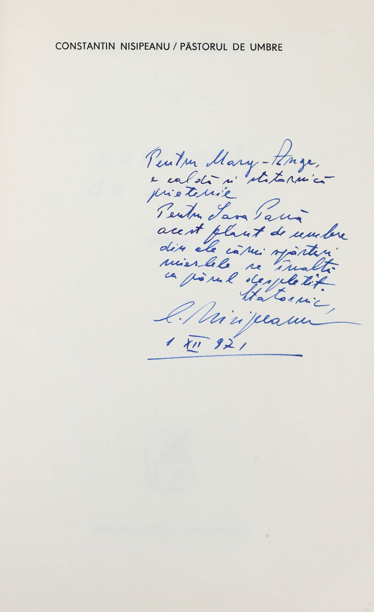 29. Lot format din două volume: ”Păstorul de umbre”, de Constantin Nisipeanu, București, 1971, și ”Scriitori care au devenit amintiri”, de Virgil Carianopol, București, 1973, cu dedicațiile autorilor către Sașa Pană, provine din colecția poetului avangardist Sașa Pană
