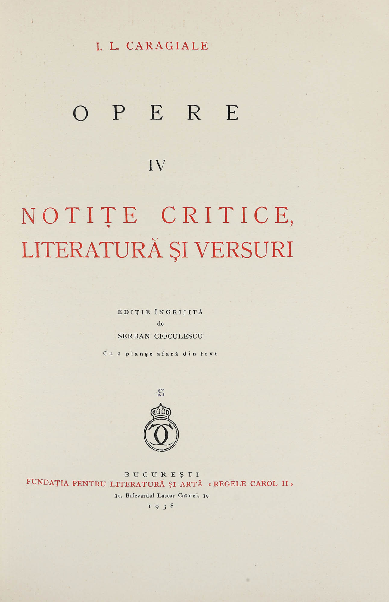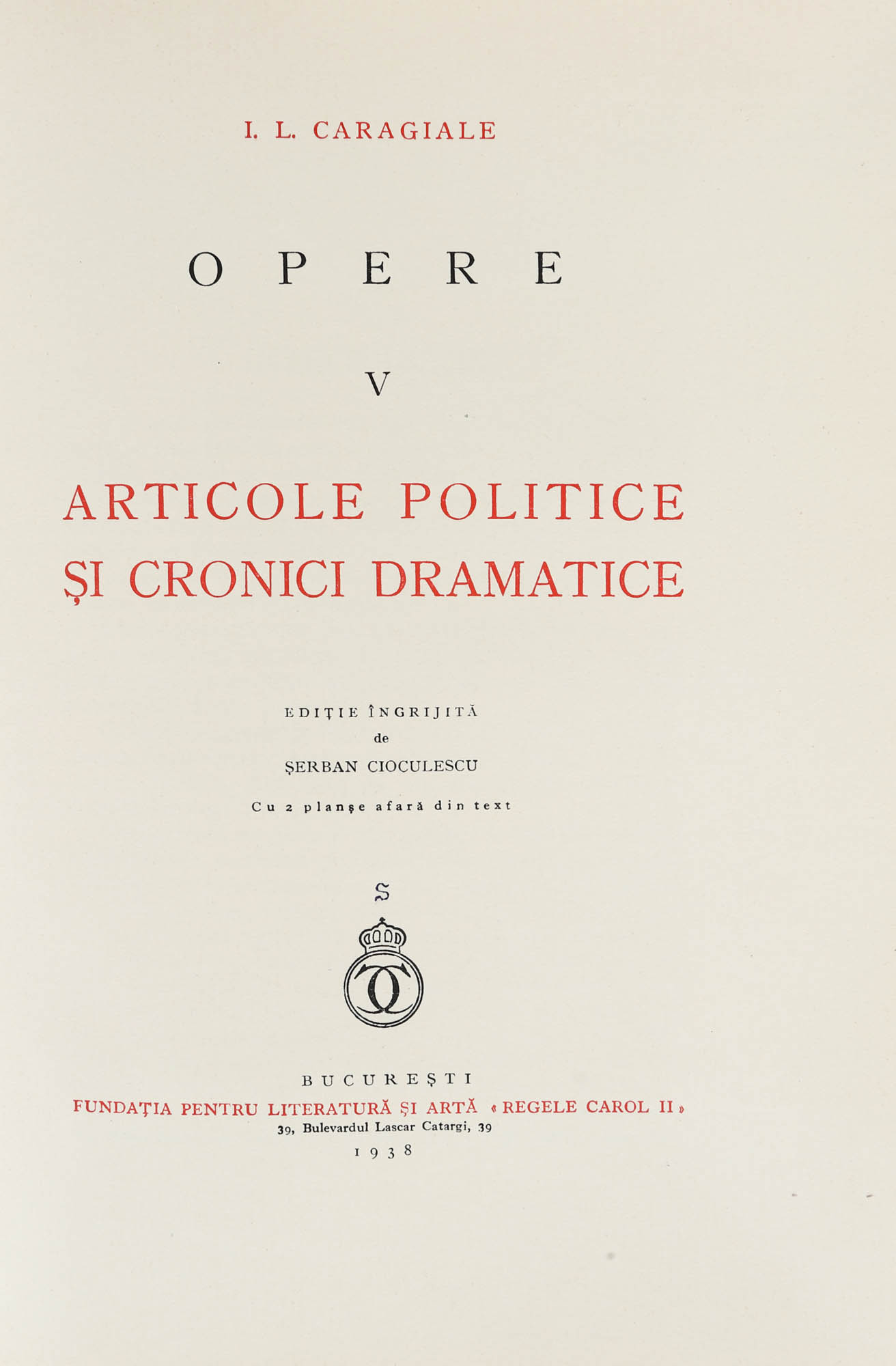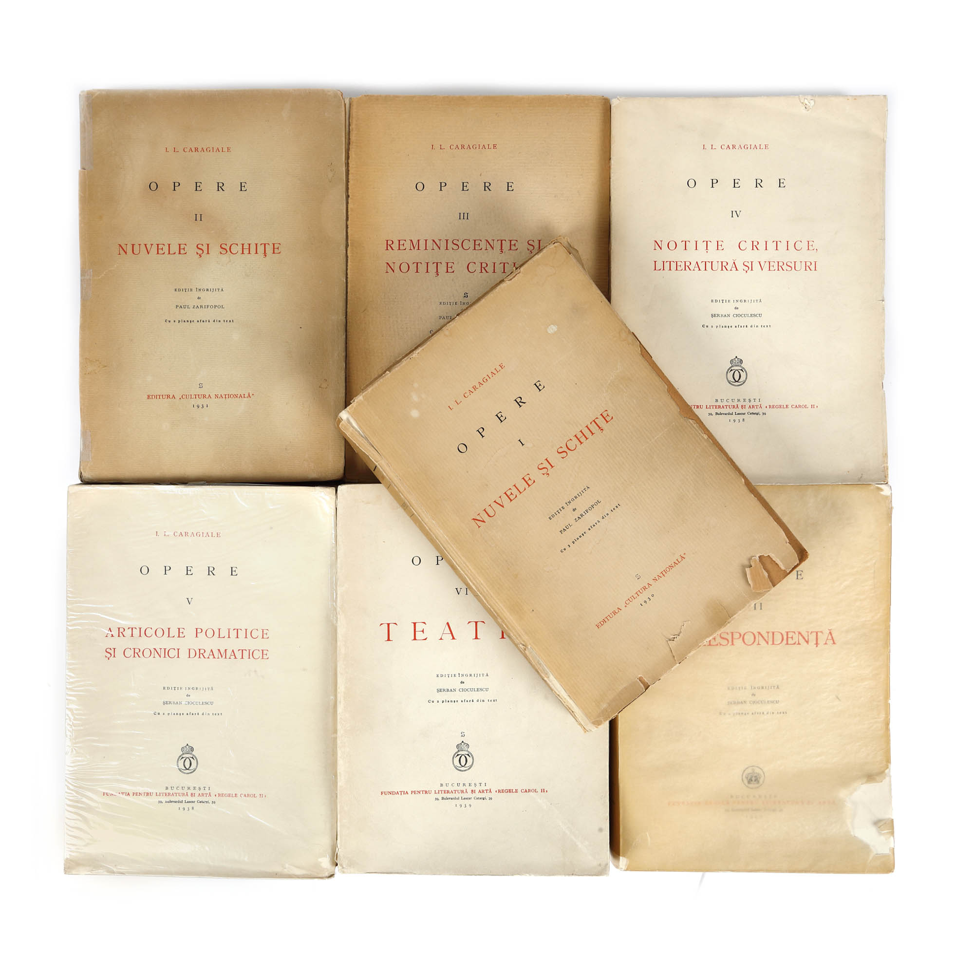 15. ”Opere”, de Ion Luca Caragiale, șapte volume, București, 1930-1942, ediție bibliofilă, cu dedicația lui Șerban Cioculescu către Barbu Slătineanu, provine din colecția Barbu Slătineanu