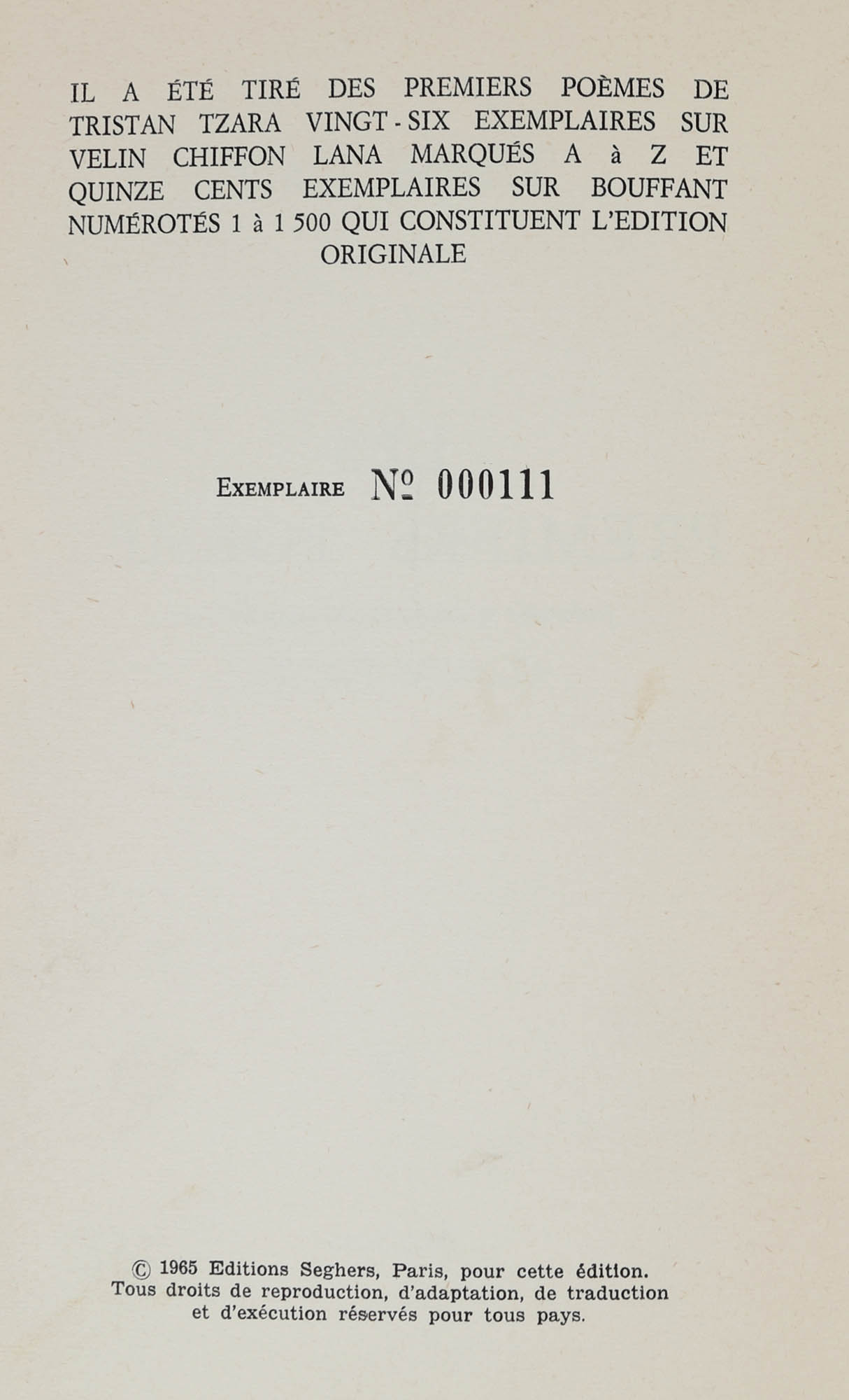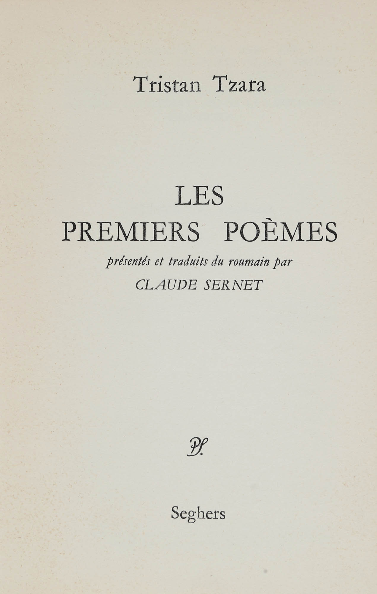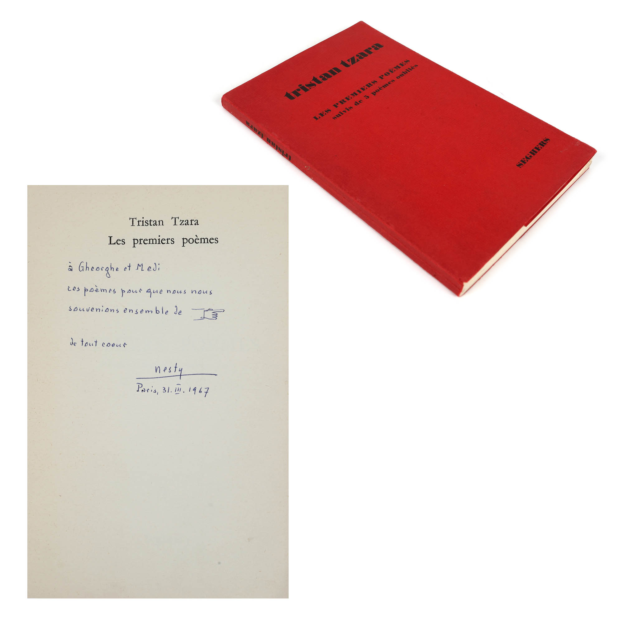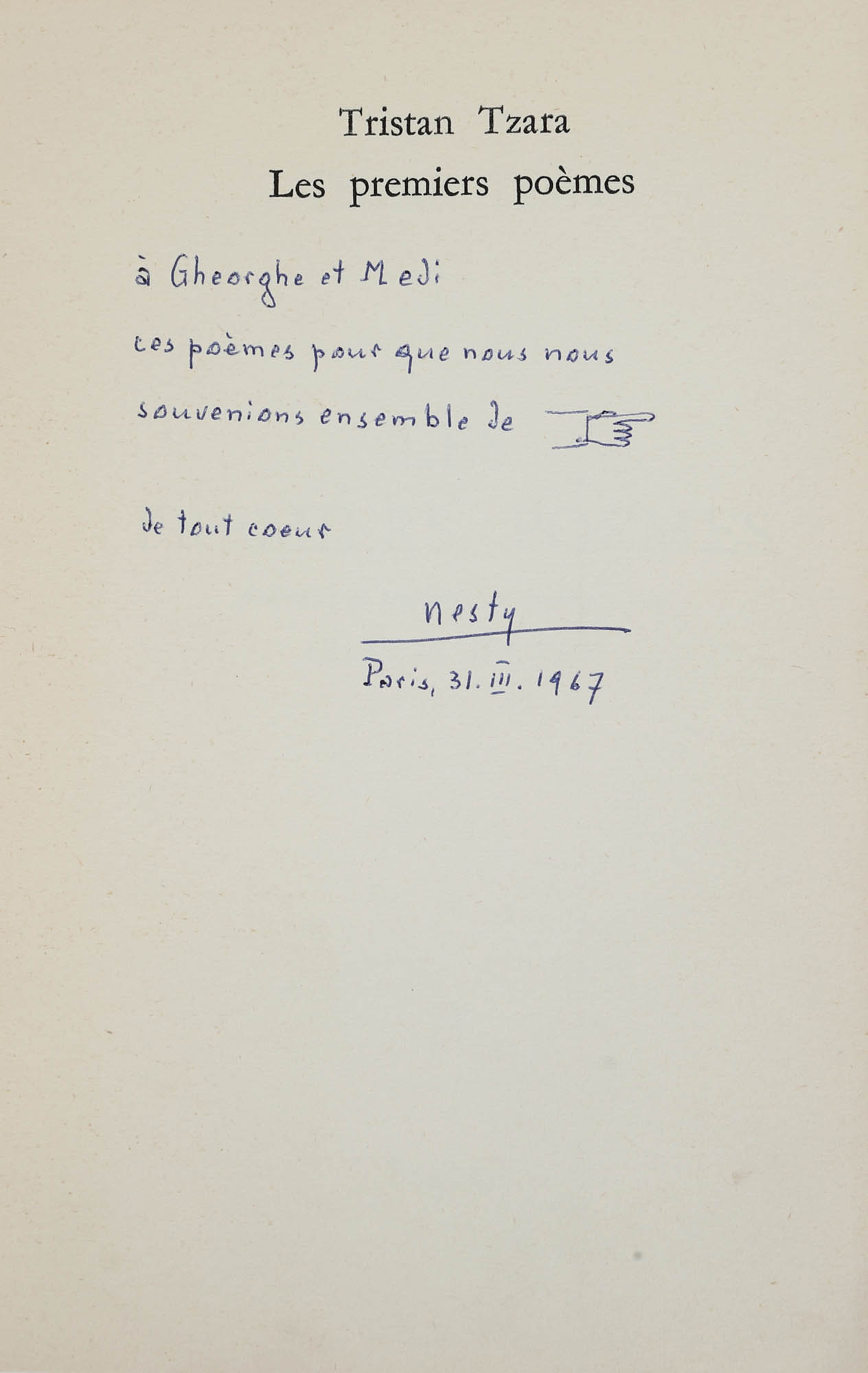 43. ”Primele poeme”, de Tristan Tzara, tradusă de Claude Sernet (Mihai Cosma), franceză, Paris, 1965, cu dedicația traducătorului către Medi Dinu și Stephan Roll