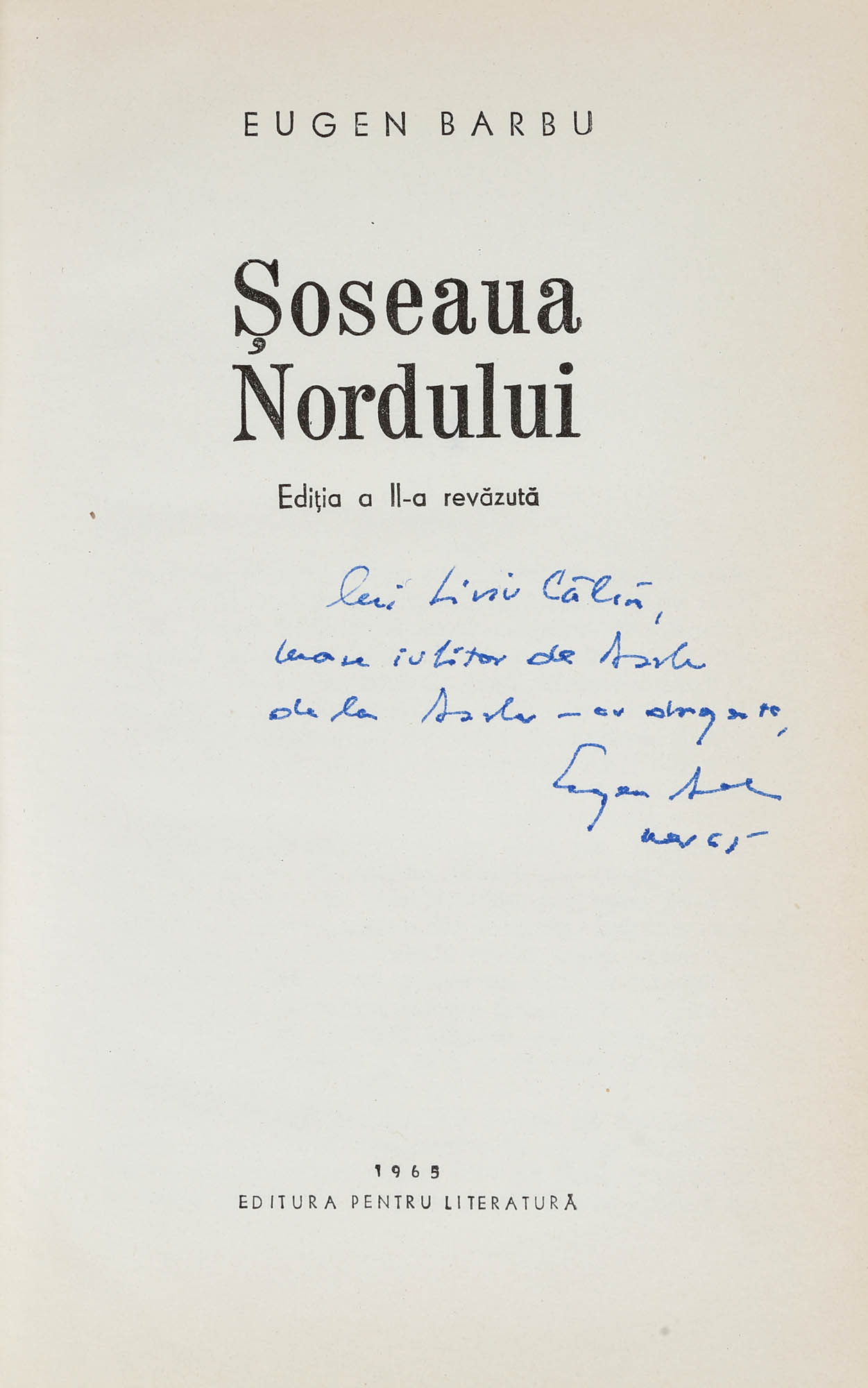 35. ”Șoseaua Nordului”, de Eugen Barbu, București, 1965, cu dedicația autorului