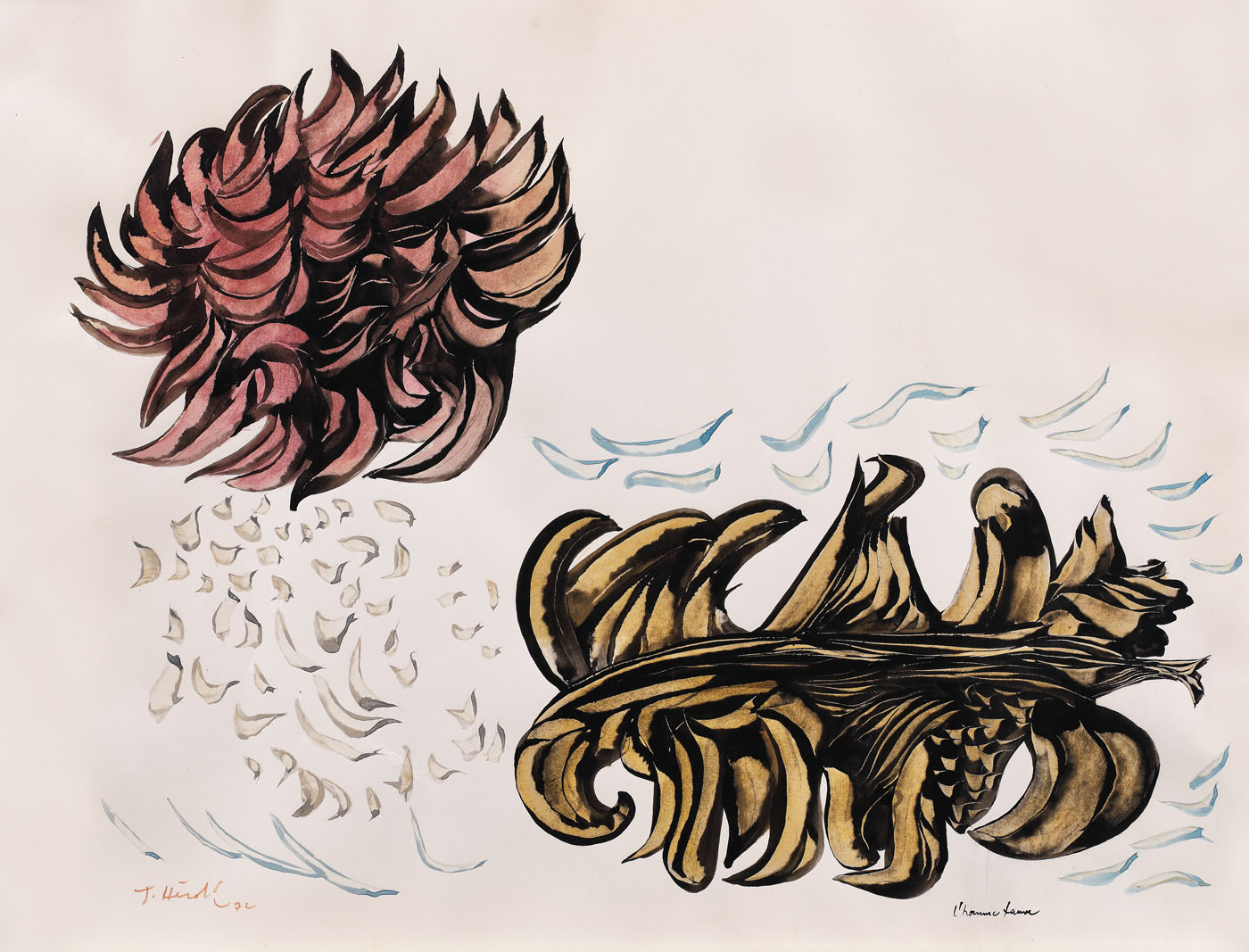 semnat și datat stânga jos, cu brun, "J. Herold, (19)72"; intitulat dreapta jos, cu negru, "l'homme fauve"