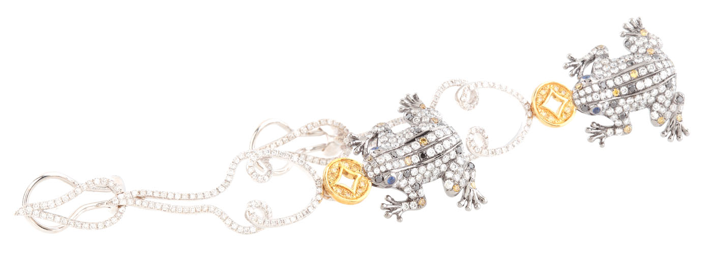 20. Simpatică pereche de cercei din aur, decorată cu broscuțe, pavată cu diamante și safire