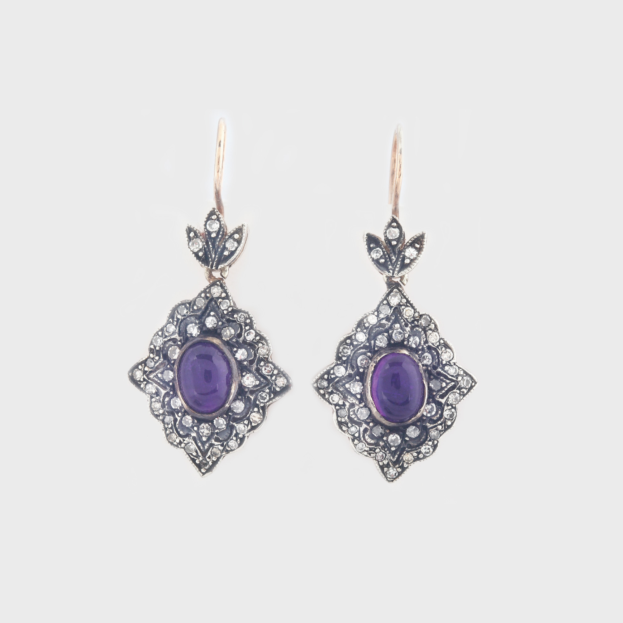 58. Rafinată pereche de cercei din aur, ornată cu diamante și ametiste în montură de argint